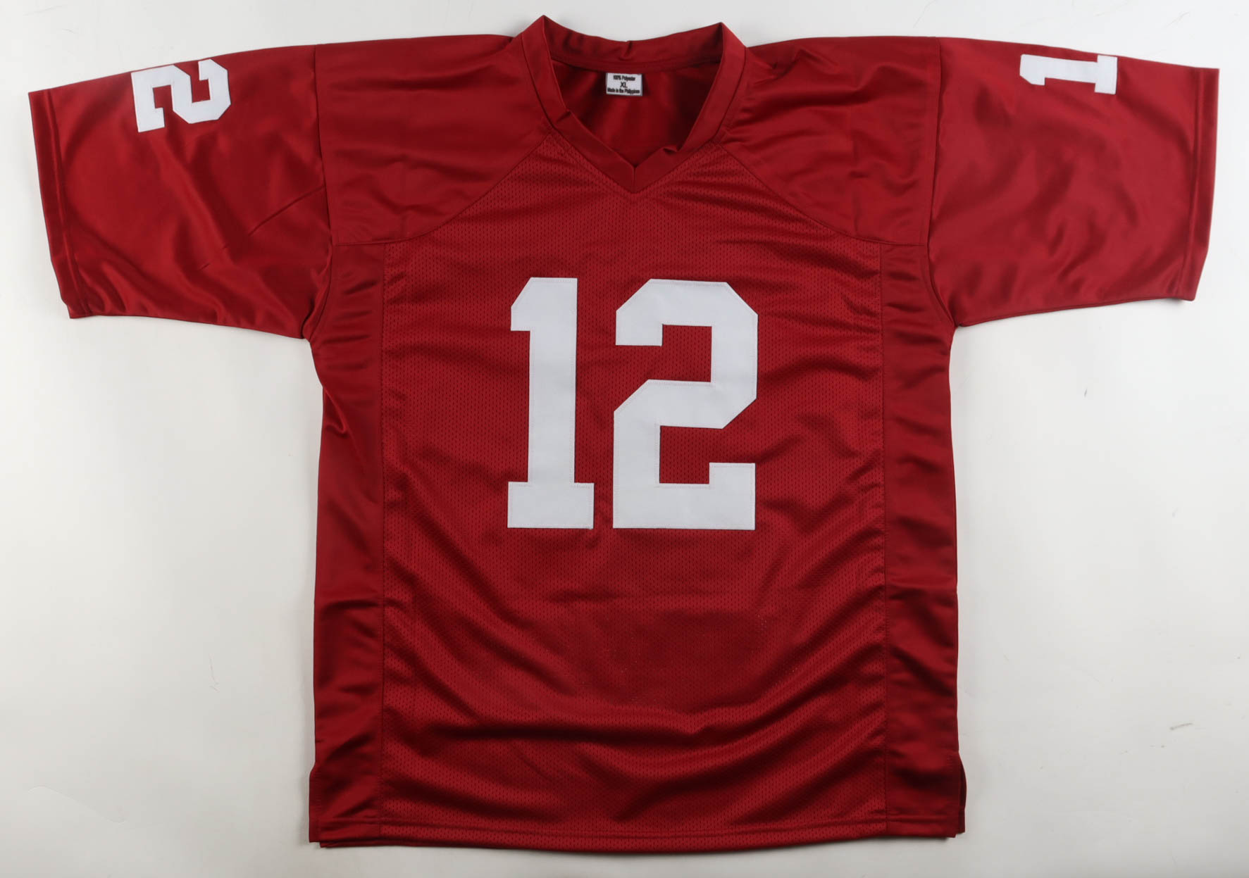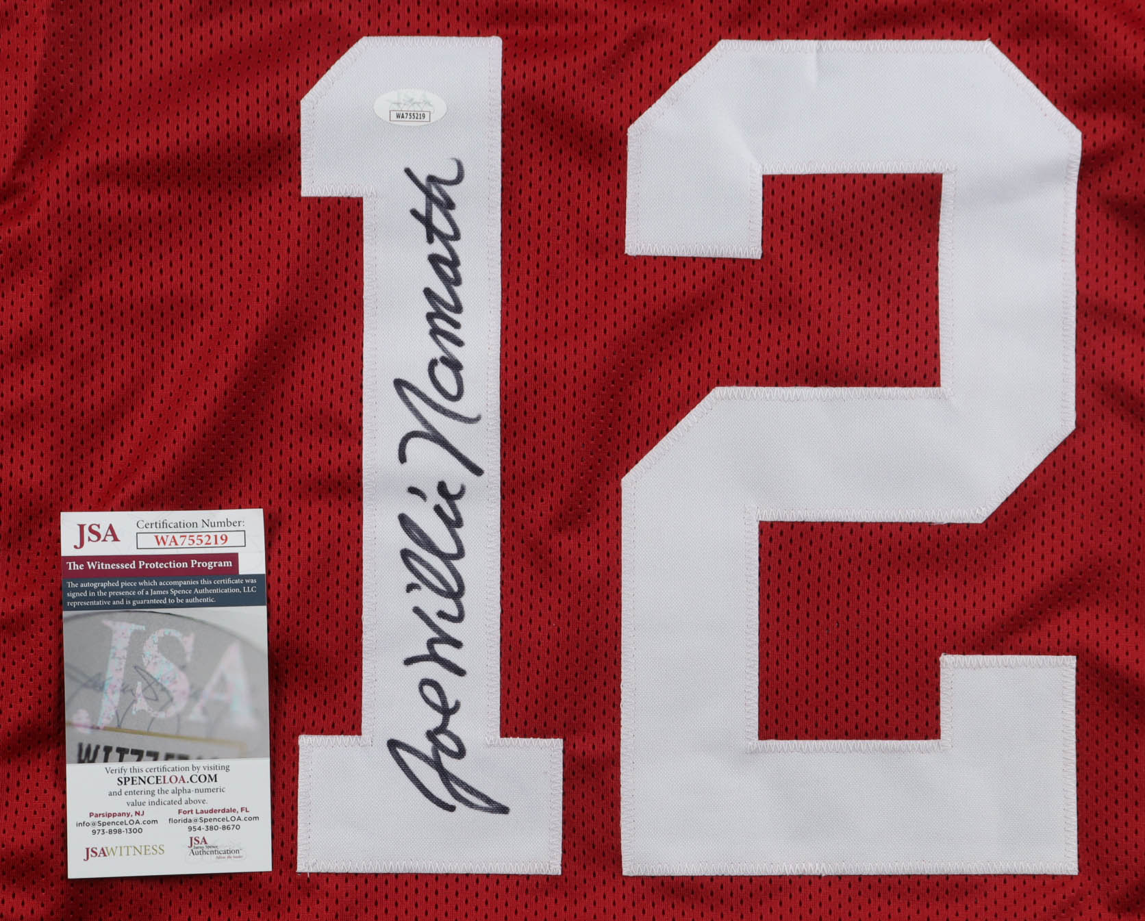 Custom jersey with everything sewn on, size XL. Hand-signed by Joe Namath (HOF). Namath's career stats have been custom stitched in the jersey below the reverse numbers.