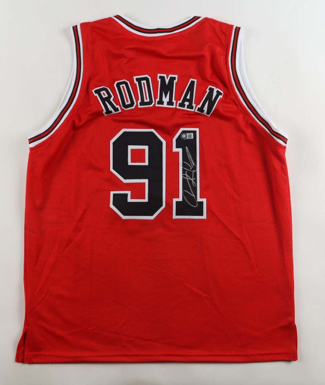 Custom jersey with everything sewn on, size XL. Hand-signed by Dennis Rodman (HOF).