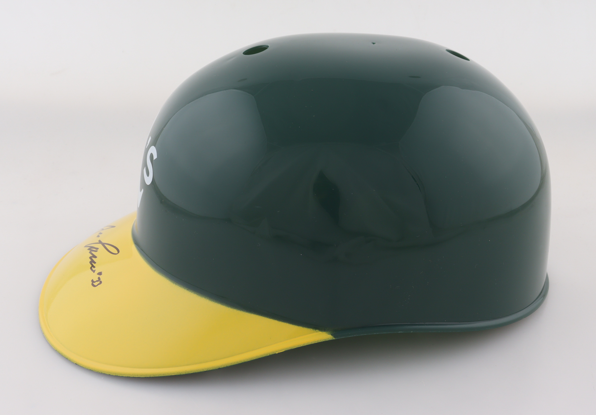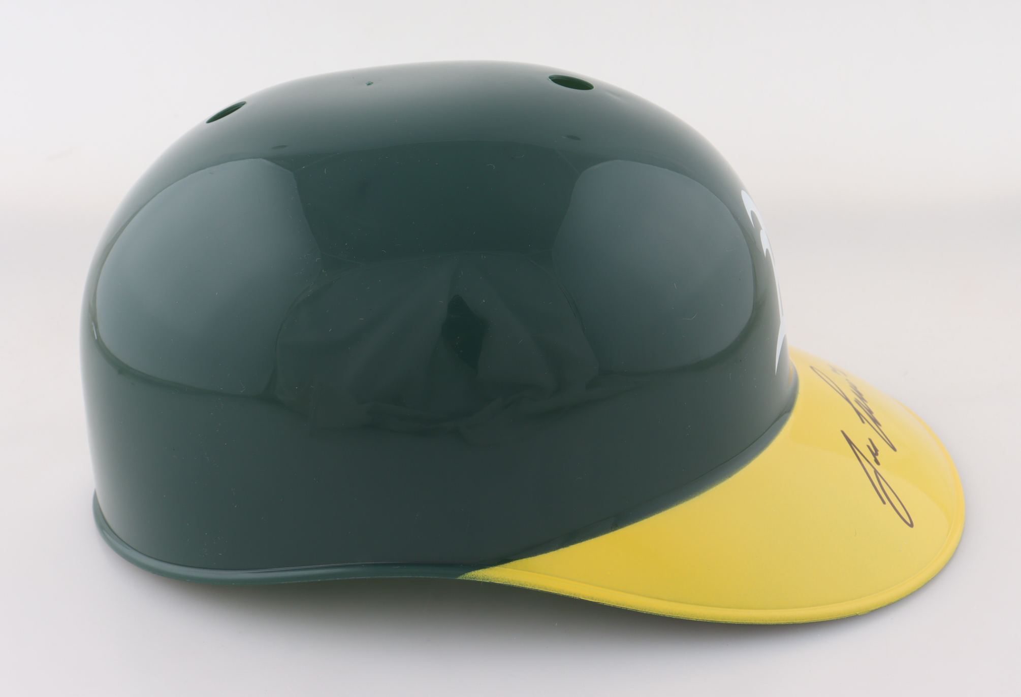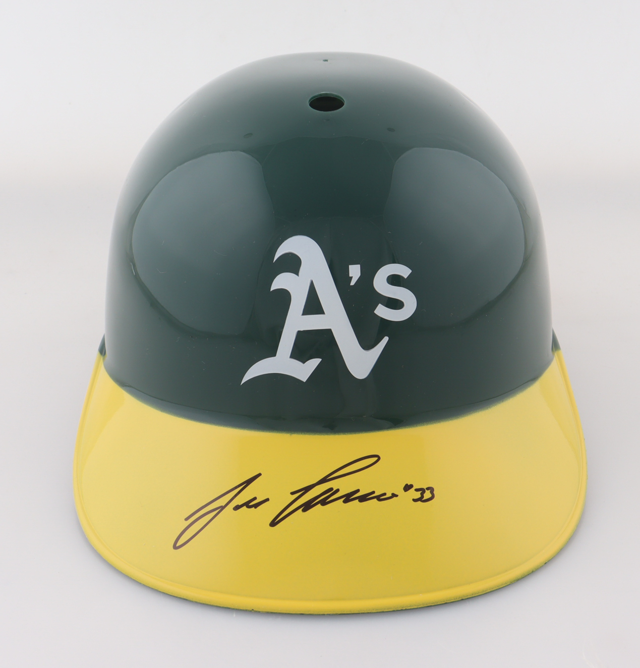 Oakland Athletics full-size plastic souvenir replica batting helmet. Hand-signed by Jose Canseco.