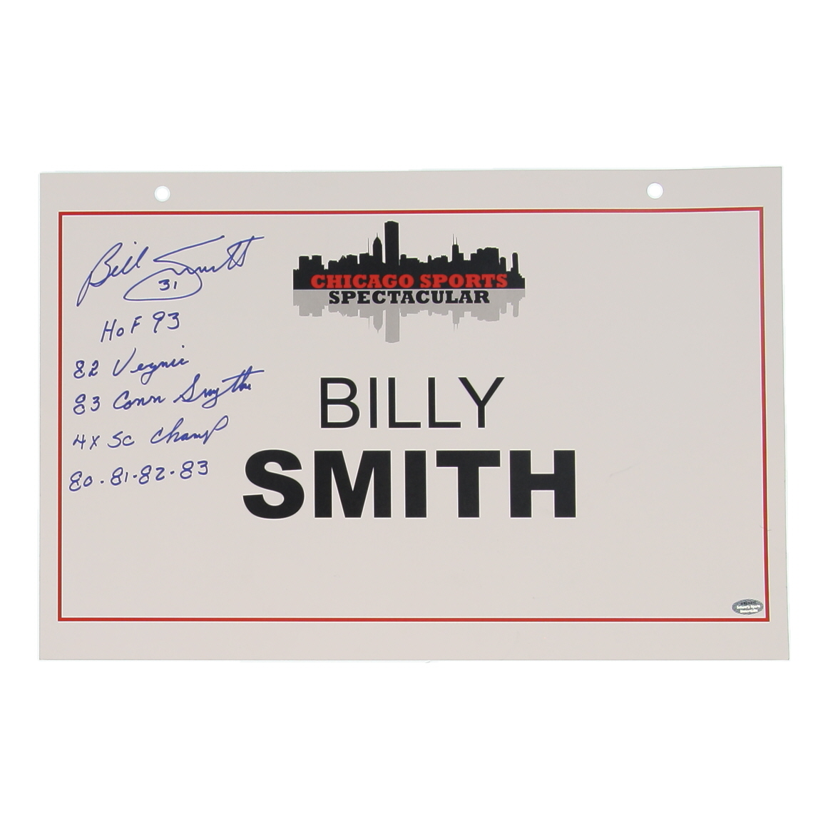 Show sign measures approximately 11" x 17" in size. Hand-signed and inscribed by Billy Smith (New York Islanders, HOF).