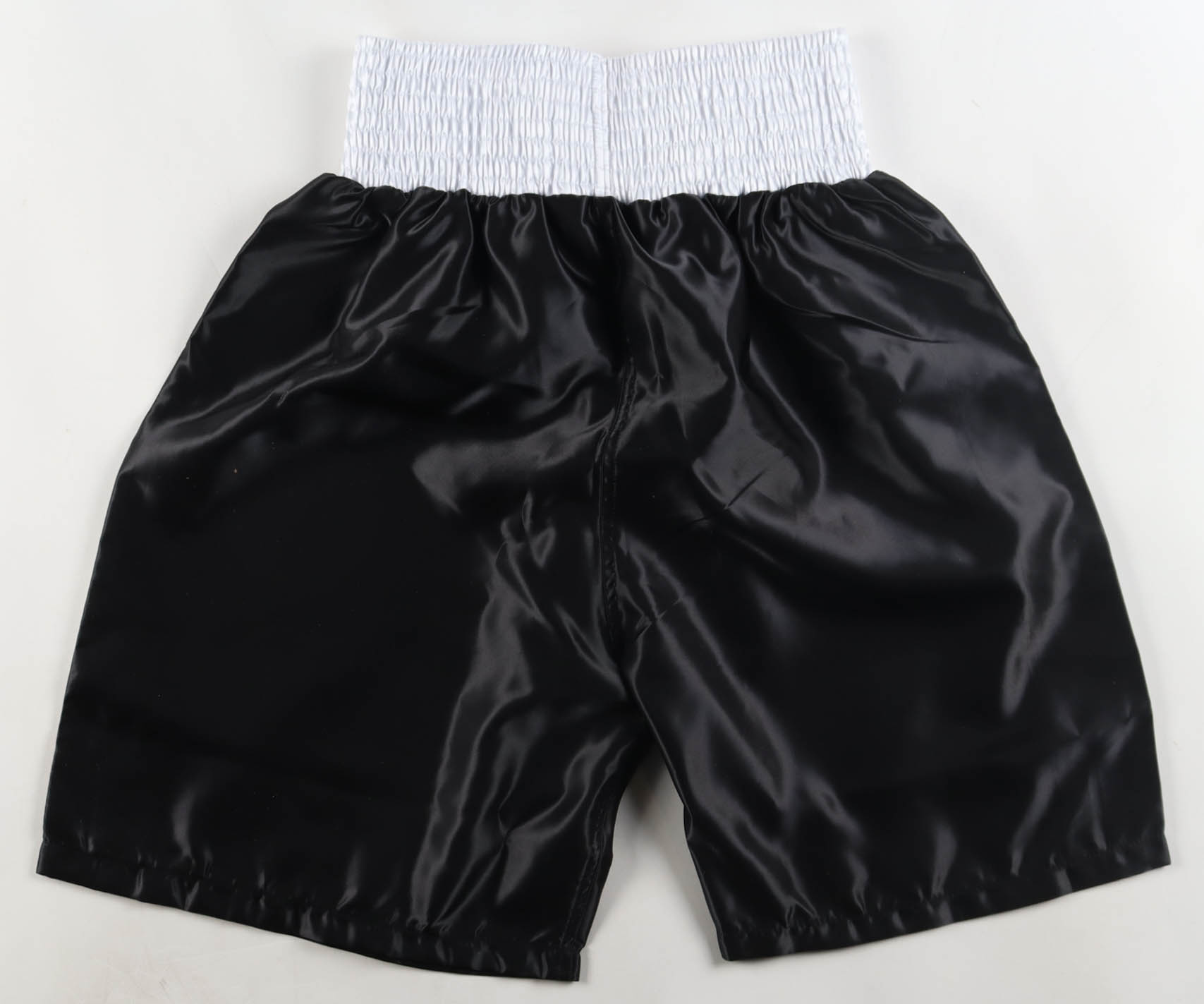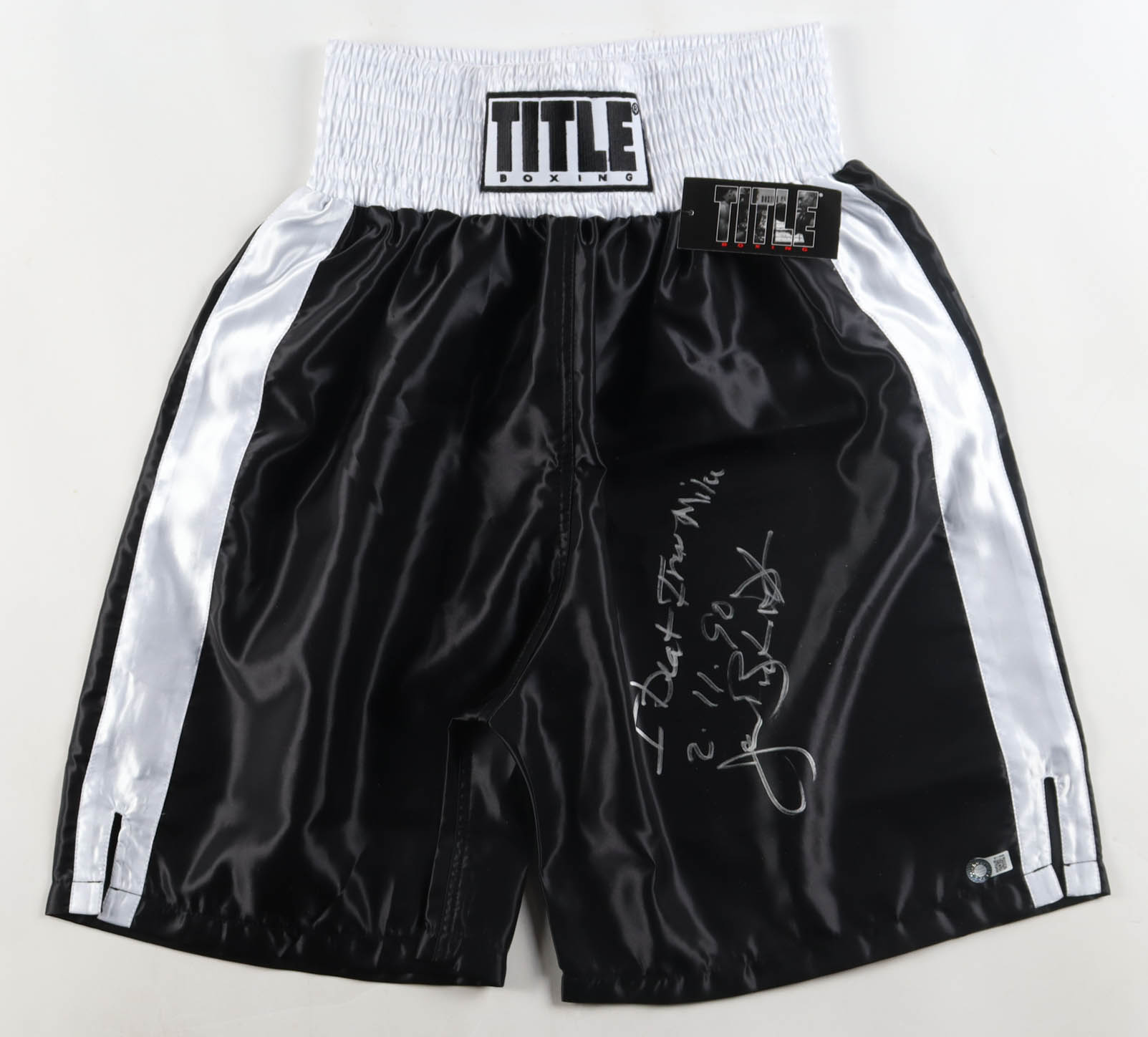 Title boxing shorts have been hand-signed and inscribed by James "Buster" Douglas.