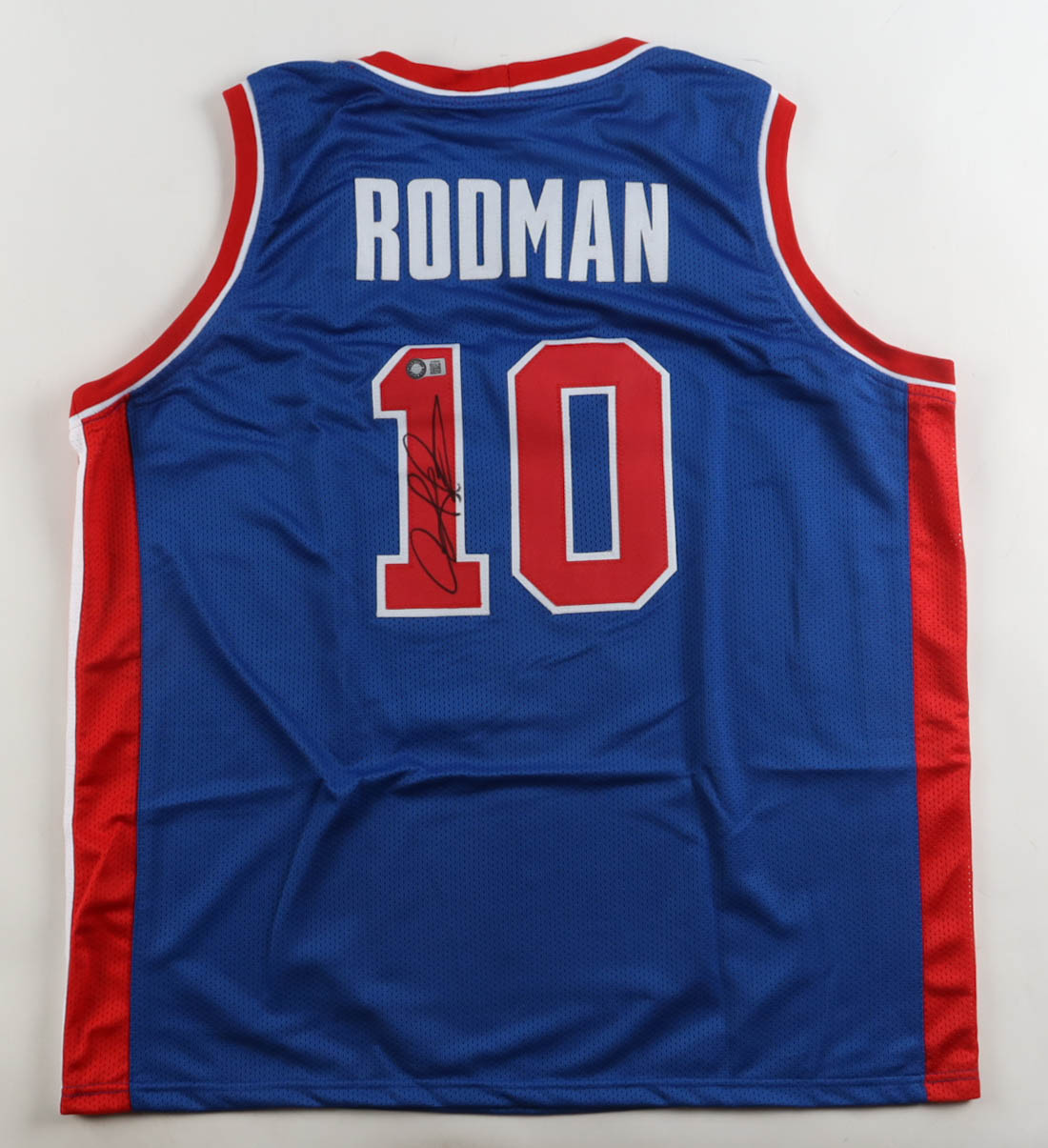 Custom jersey with everything sewn on, size XL. Hand-signed by Dennis Rodman (HOF).