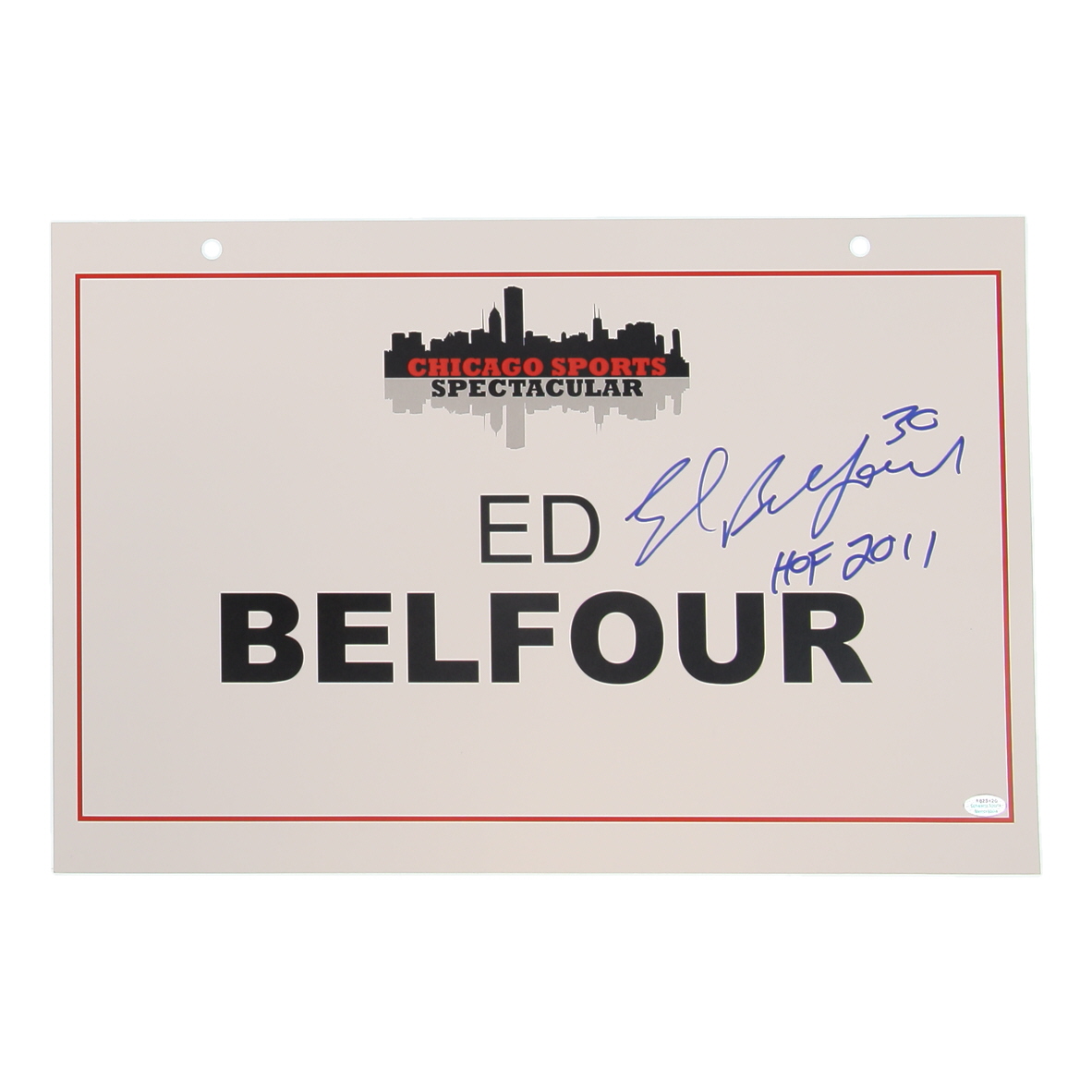 Show sign measures approximately 11" x 17" in size. Hand-signed by Ed Belfour (Chicago Blackhawks, HOF).