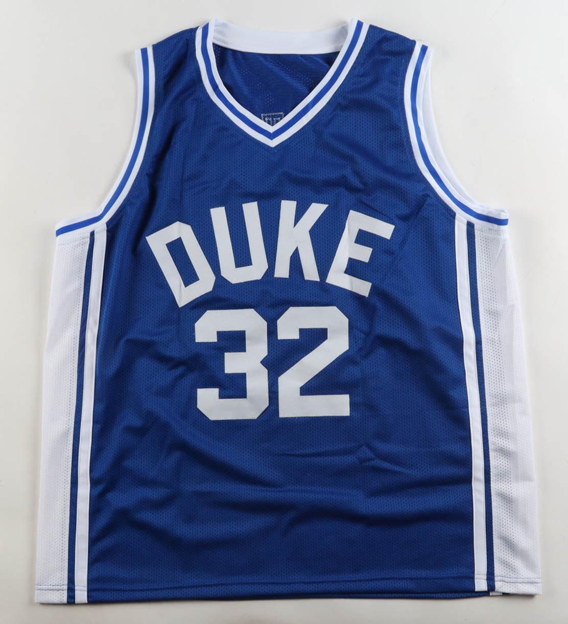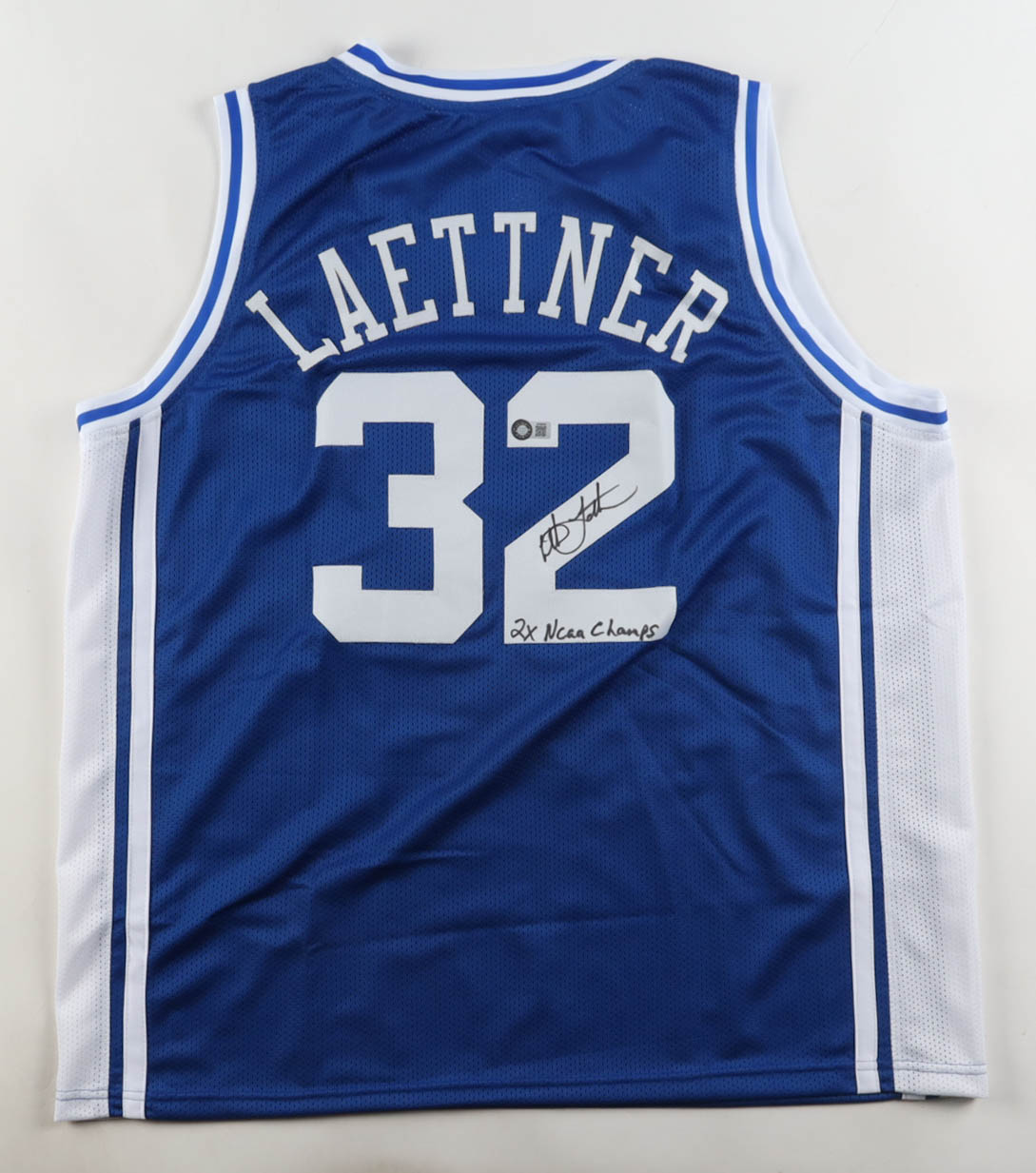 Custom jersey with everything sewn on, size XL. Hand-signed and inscribed by Christian Laettner.