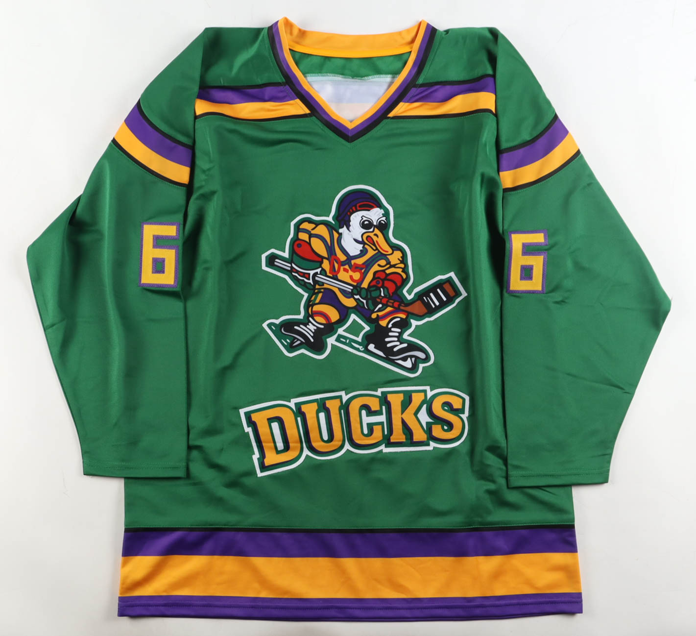 Custom jersey with everything sewn on, size XL. Hand-signed by Emilio Estevez (Gordon Bombay). Please note, glue is visible through the reverse number.