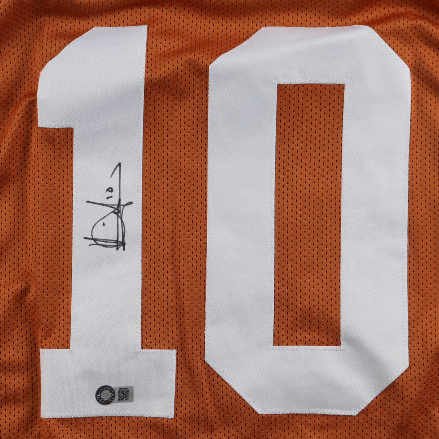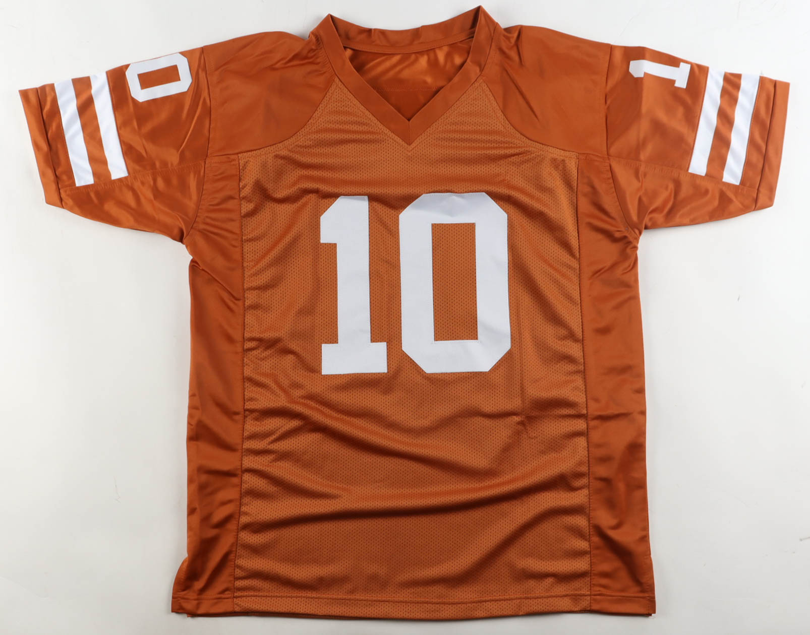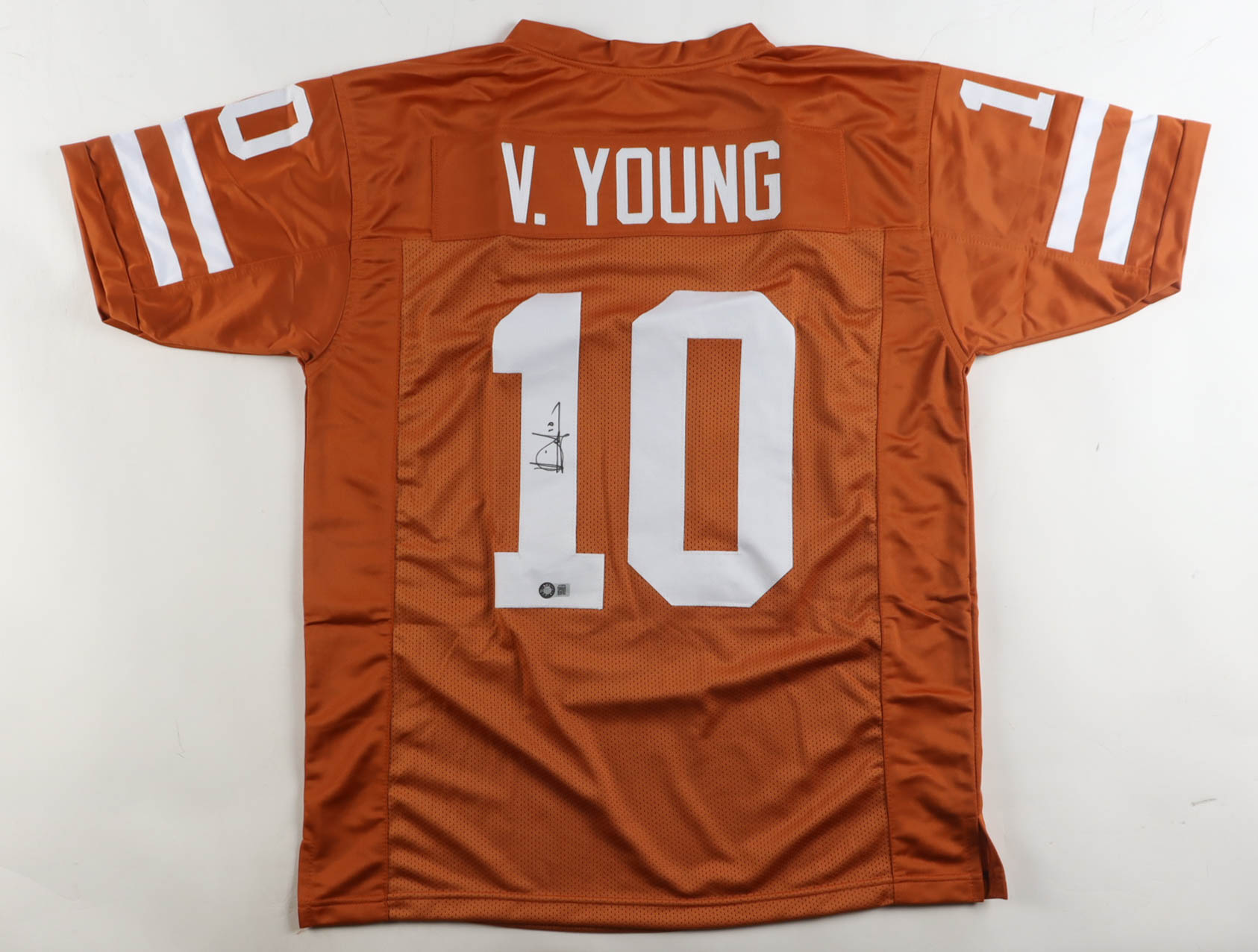 Custom jersey with everything sewn on, size XL. Hand-signed by Vince Young (Texas Longhorns).