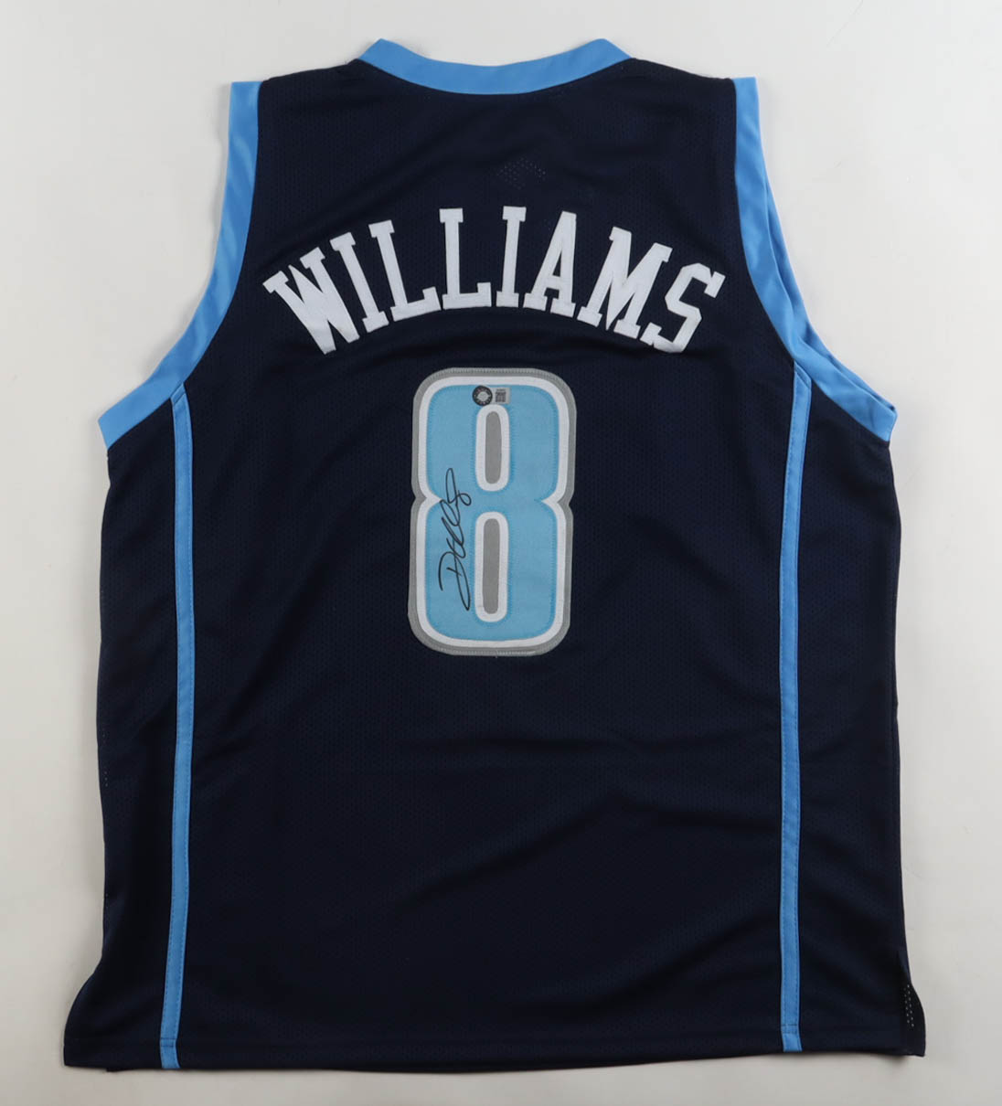 Custom jersey with everything sewn on, size XL. Hand-signed by Deron Williams.