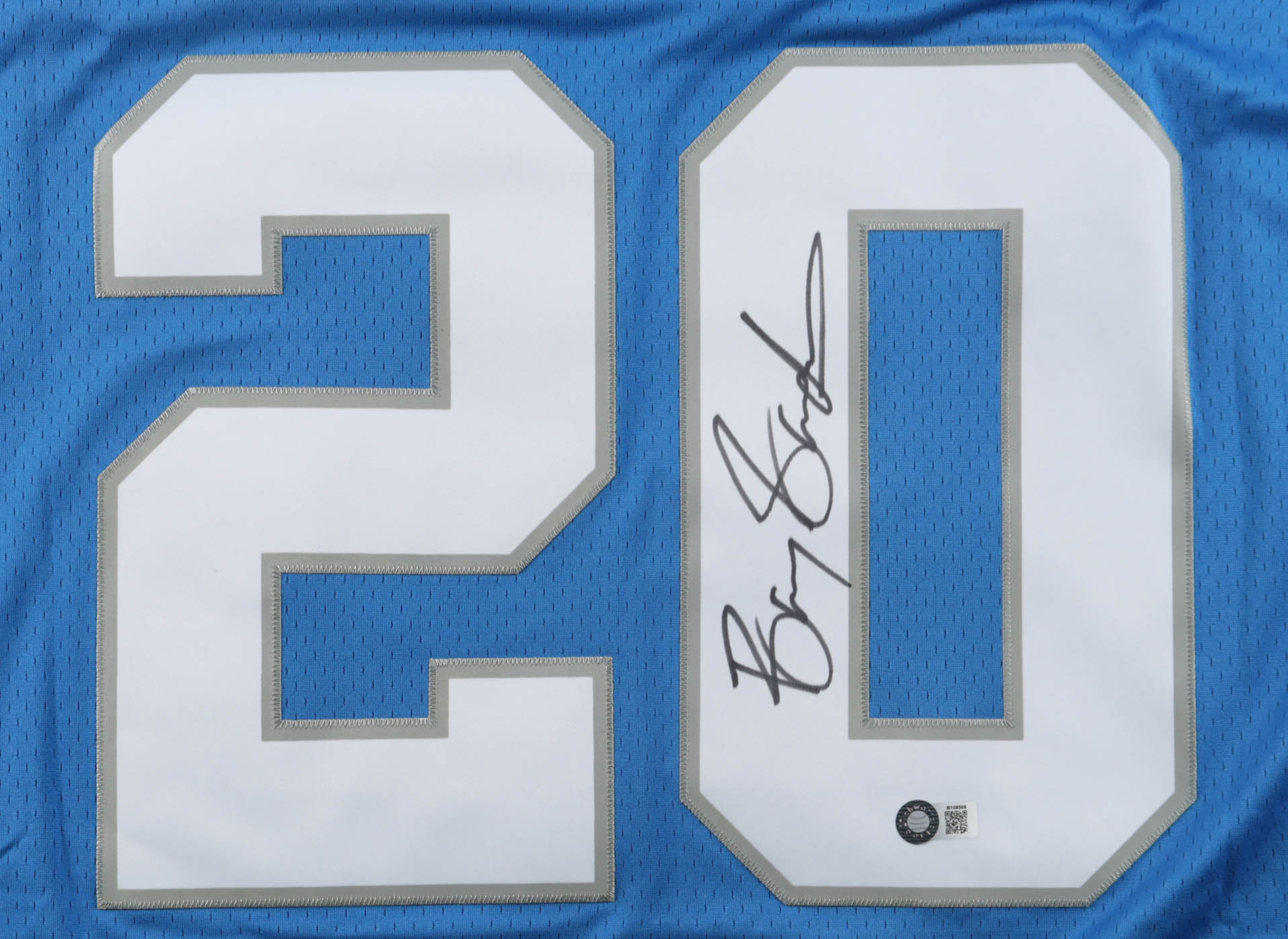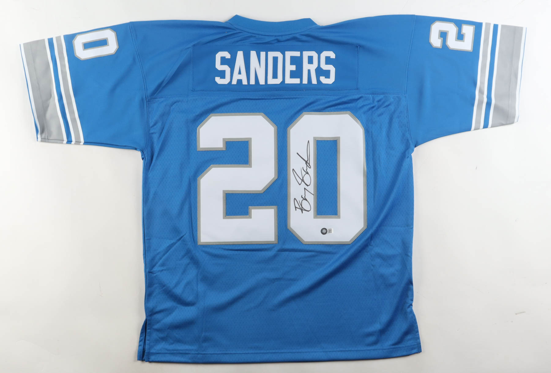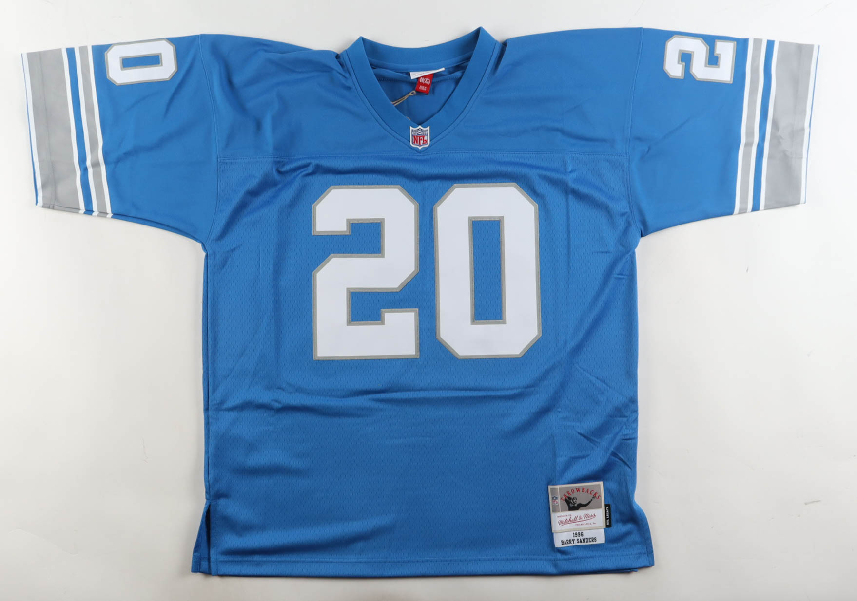 Mitchell & Ness authentic jersey with everything sewn on, size 48. Hand-signed by Barry Sanders (Detroit Lions, HOF).