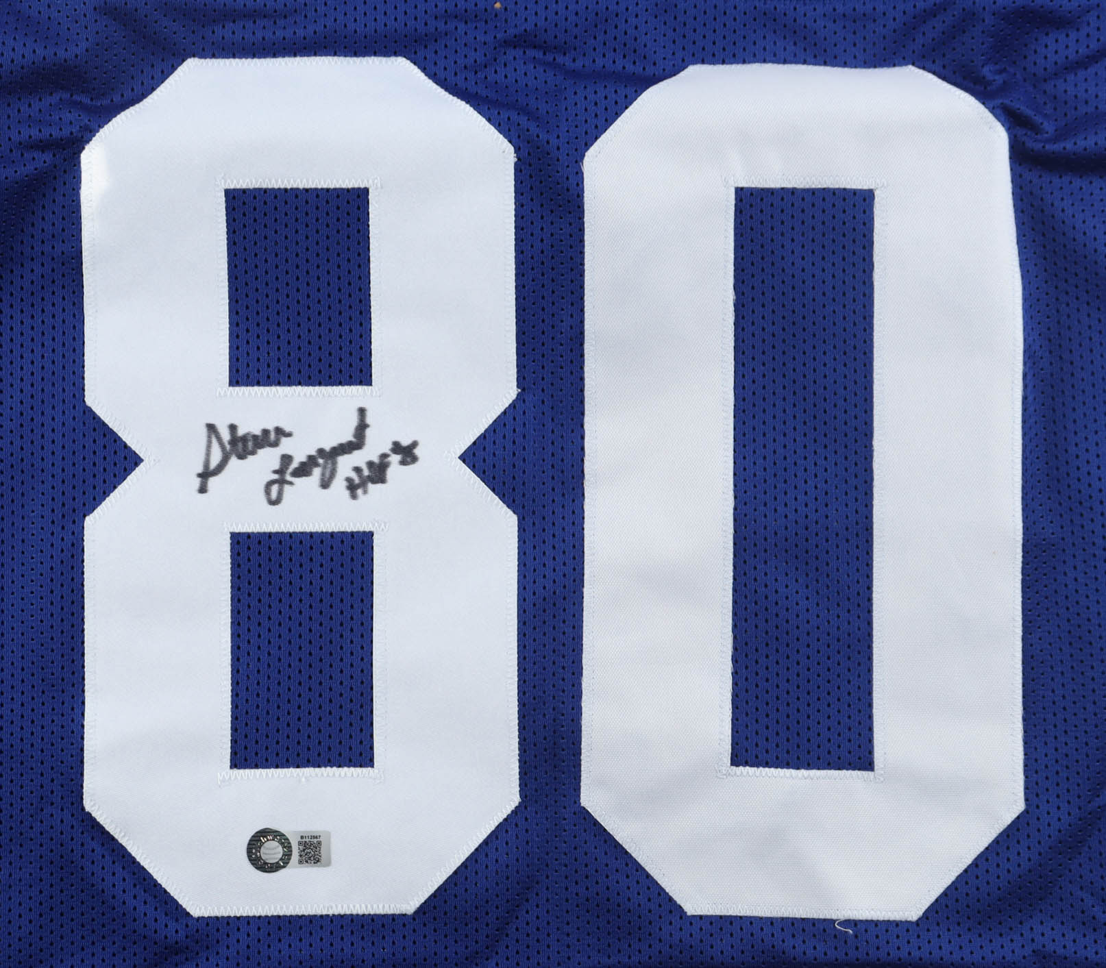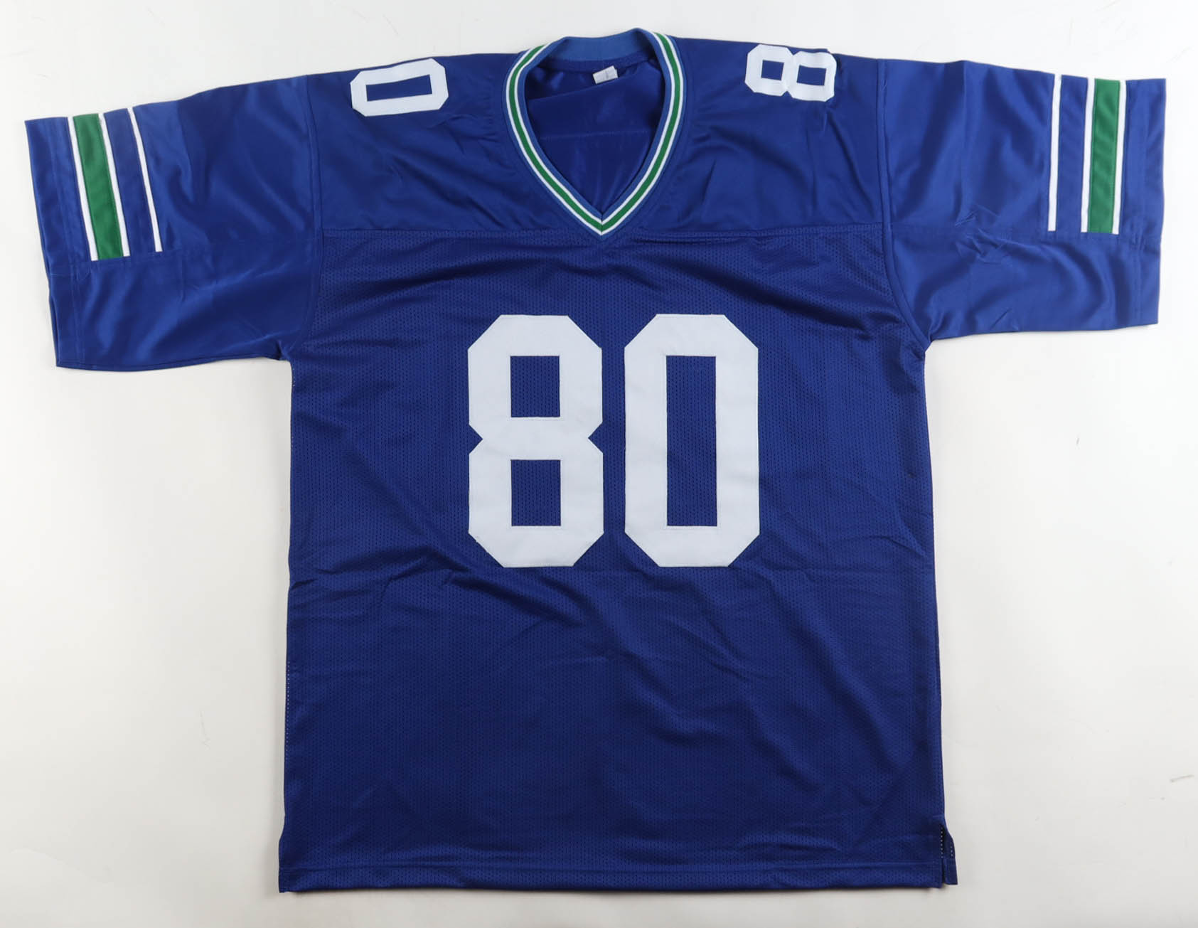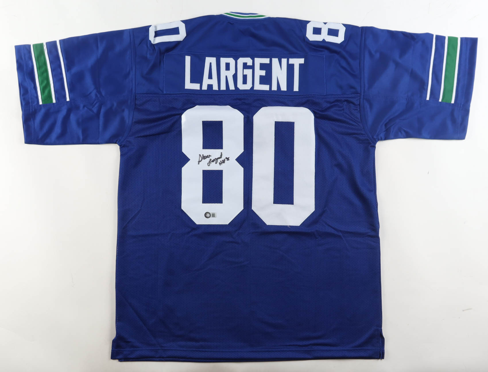 Custom jersey with everything sewn on, size XL. Hand-signed and inscribed by Steve Largent (HOF). Please note, glue is visible through the reverse number.