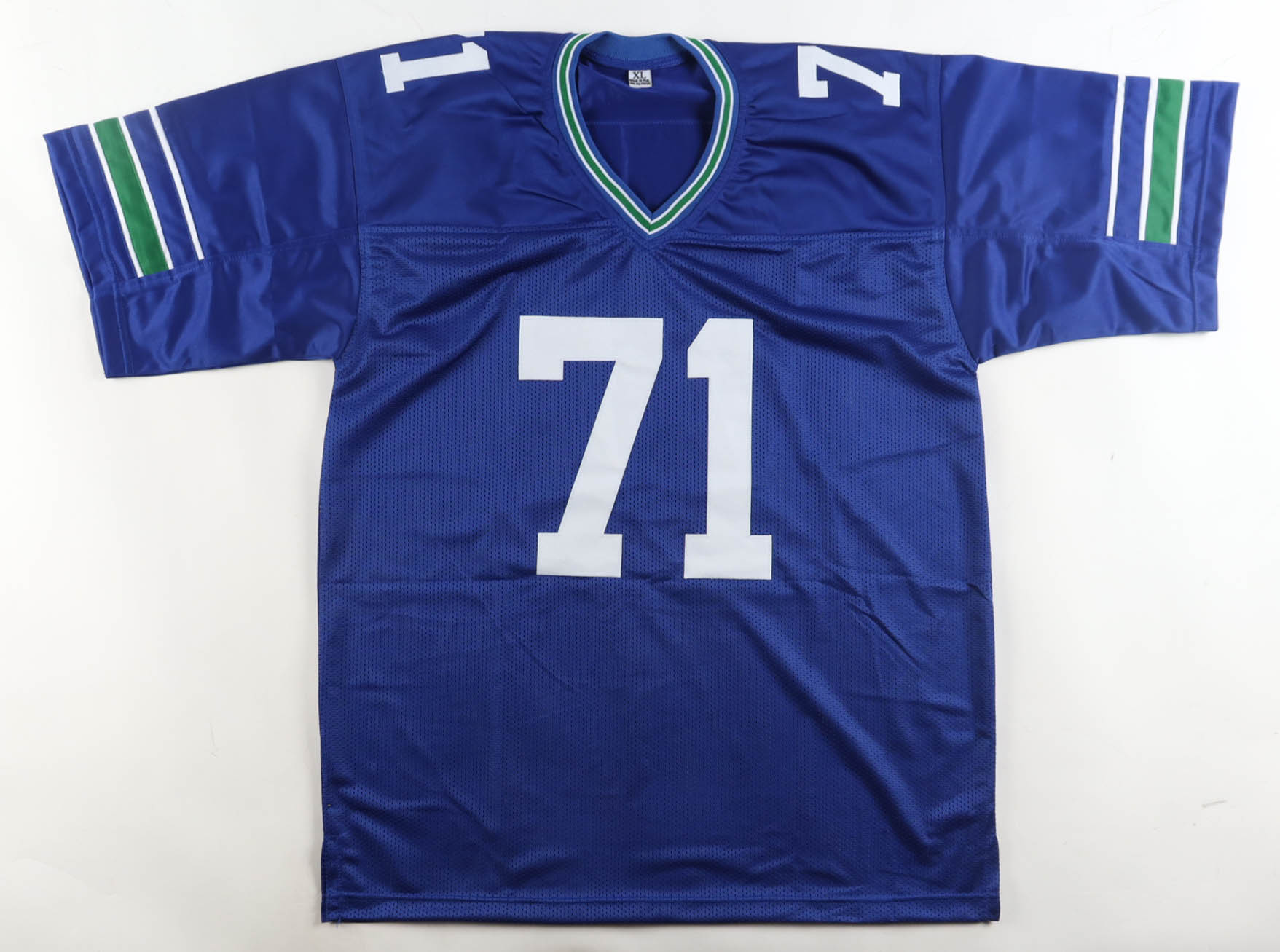 Custom jersey with everything sewn on, size XL. Hand-signed and inscribed by Walter Jones (Seattle Seahawks, HOF).