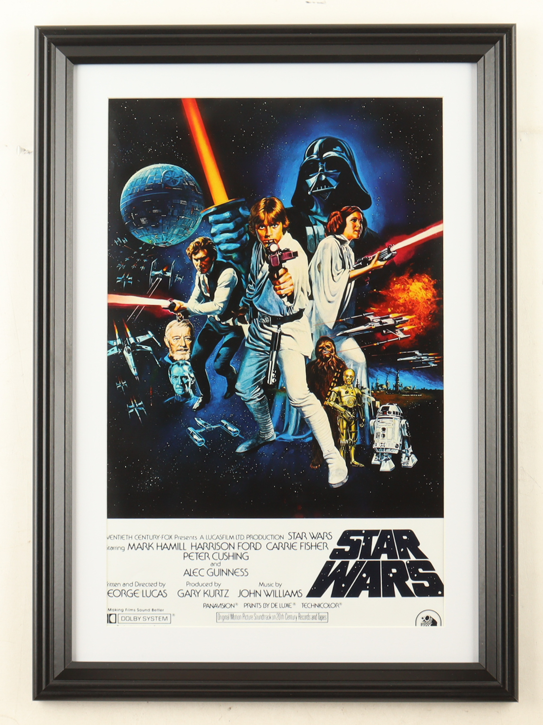 Custom frame measures approximately 15" x 21" in size. The display features a Star Wars: A New Hope 1977 print. Please note frame is unsigned. Refer to photo regarding the condition of the item.