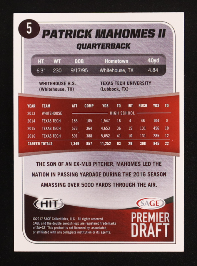 Patrick Mahomes II 2017 SAGE HIT Premier Draft Silver #5 RC