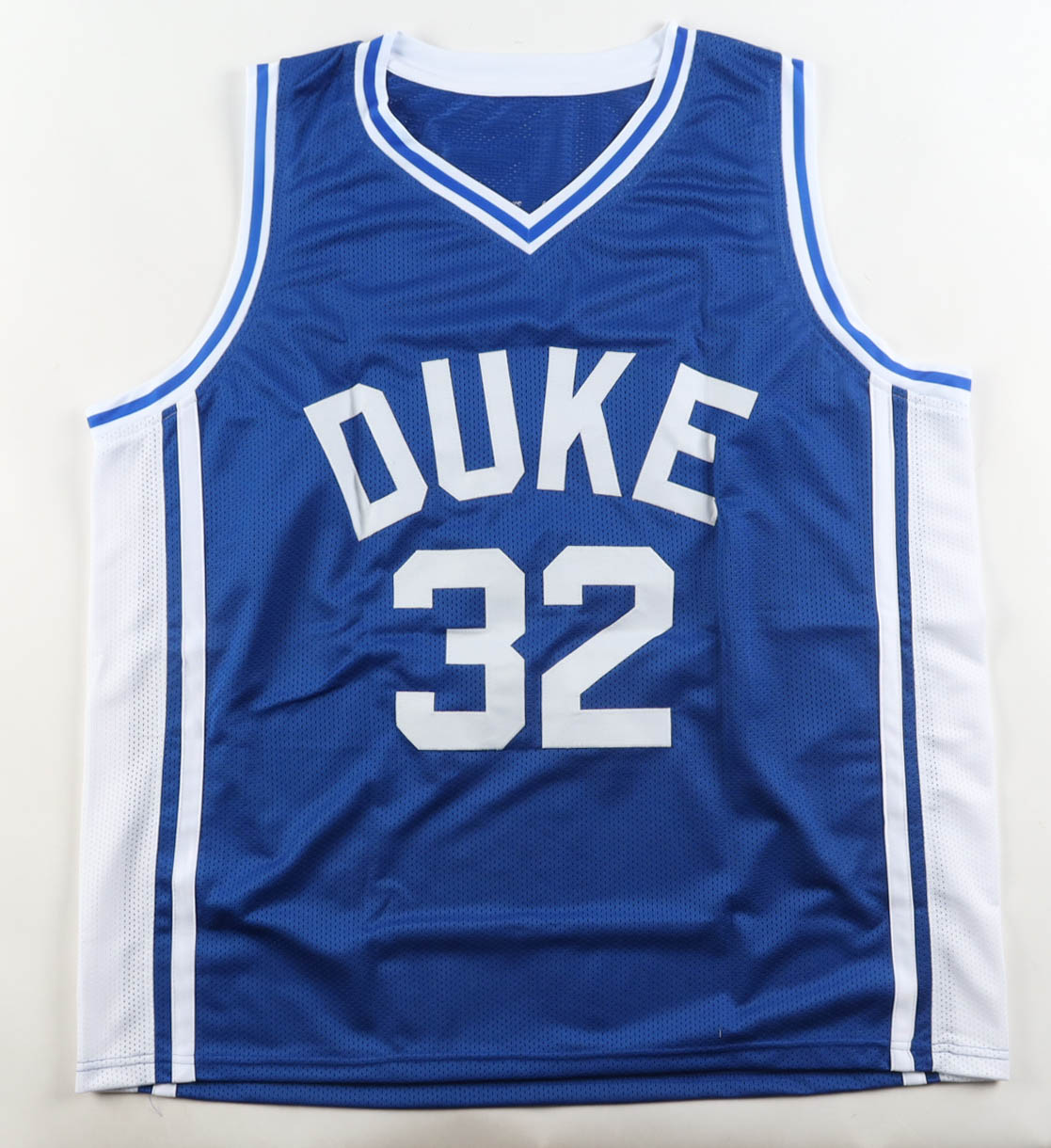 Custom jersey with everything sewn on, size XL. Hand-signed and inscribed by Christian Laettner.