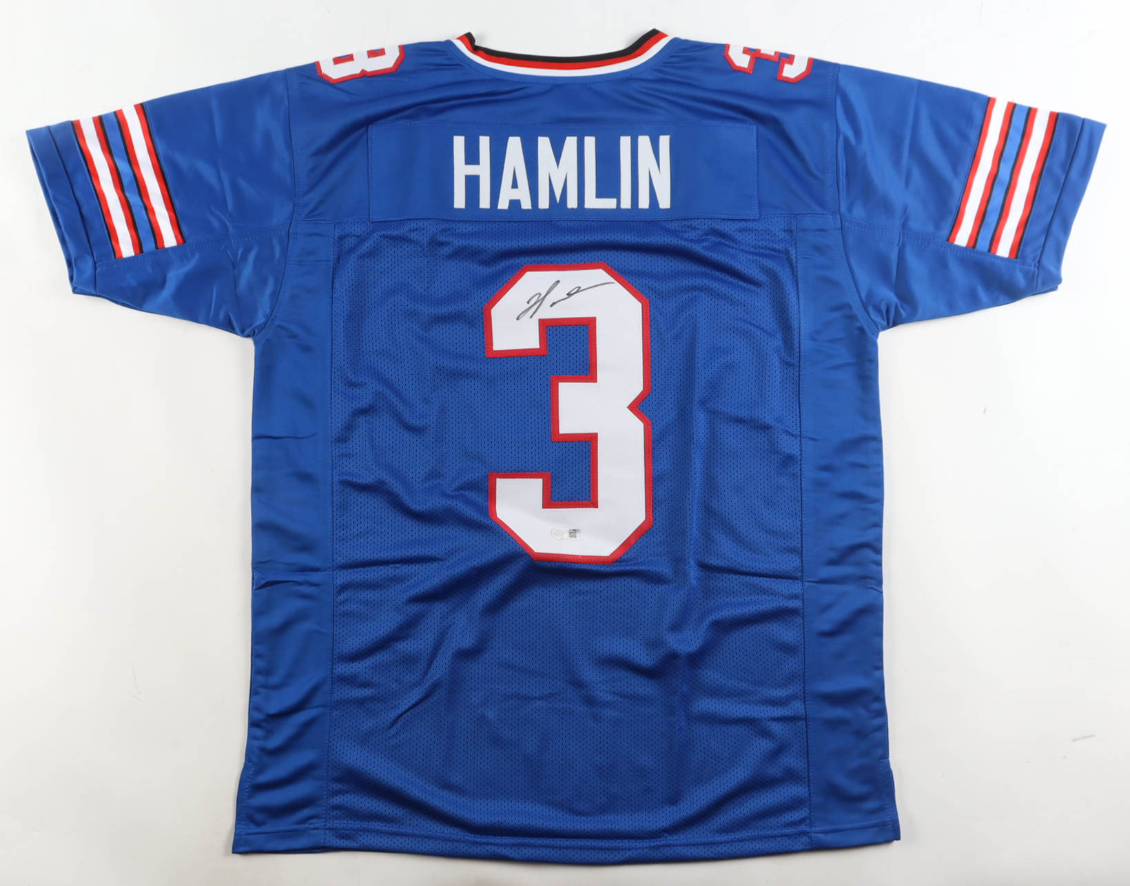 Custom jersey with everything sewn on, size XL. Hand-signed by Damar Hamlin.