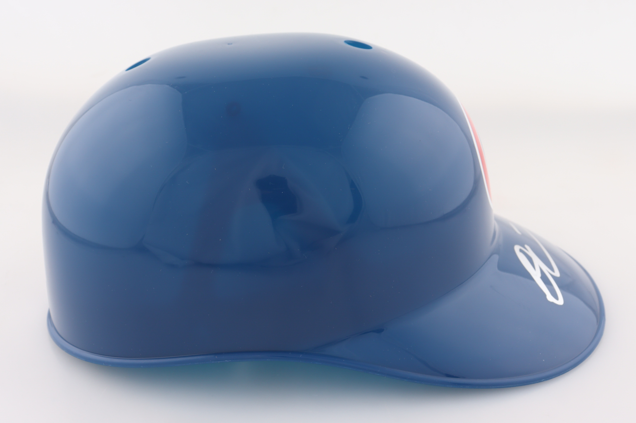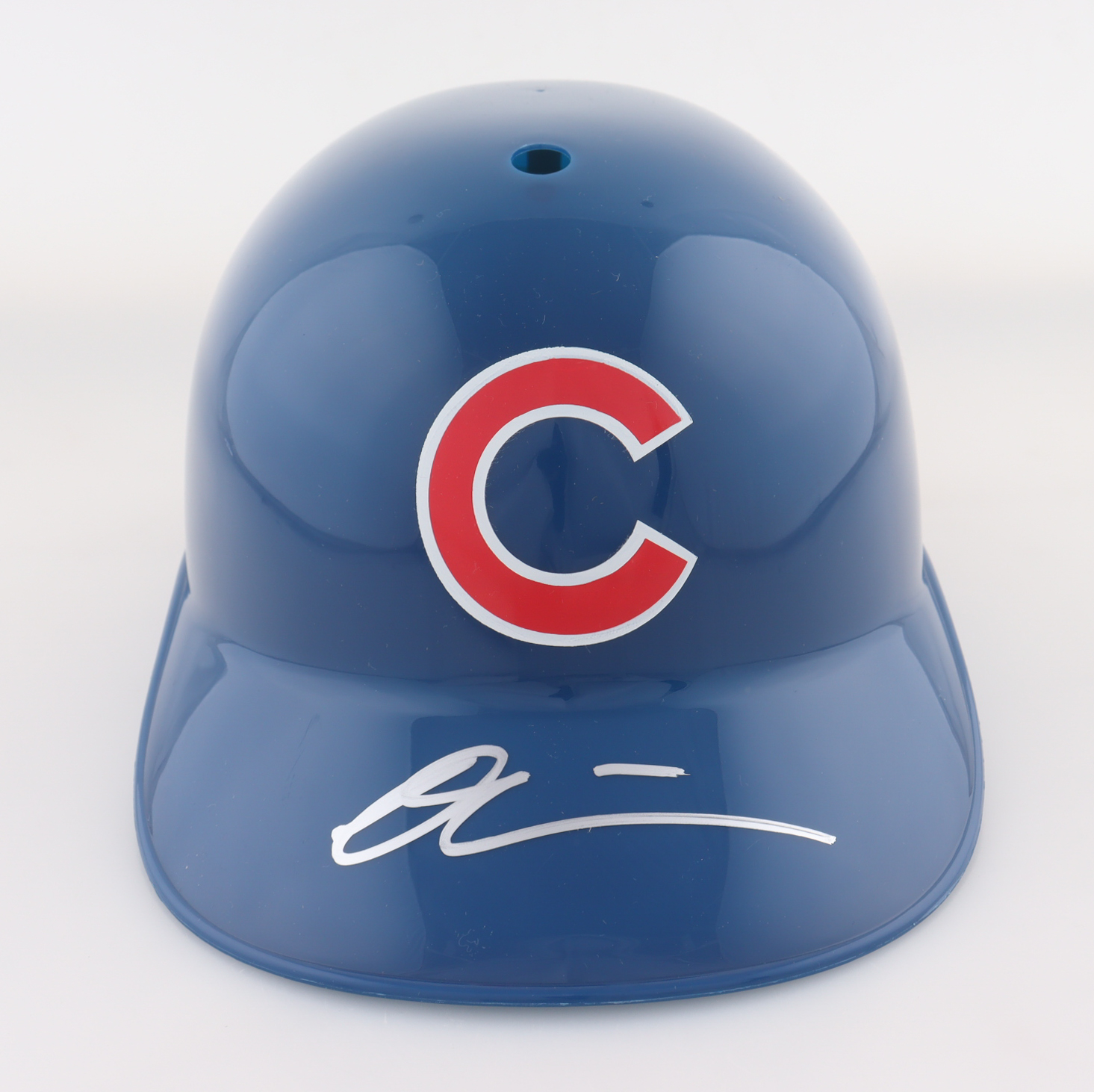 Chicago Cubs full-size replica plastic souvenir batting helmet. Hand-signed by Owen Caissie.