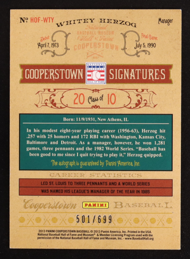 Whitey Herzog 2013 Panini Cooperstown Signatures #HOFWTY #501/699