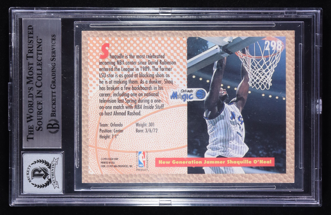Shaquille O'Neal Signed 1992-93 Fleer Slam Dunk #298 RC (BGS | Autograph Graded BGS 10)
