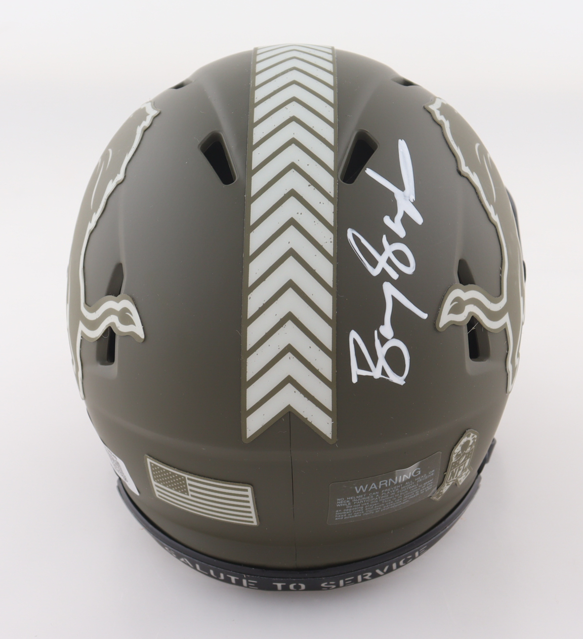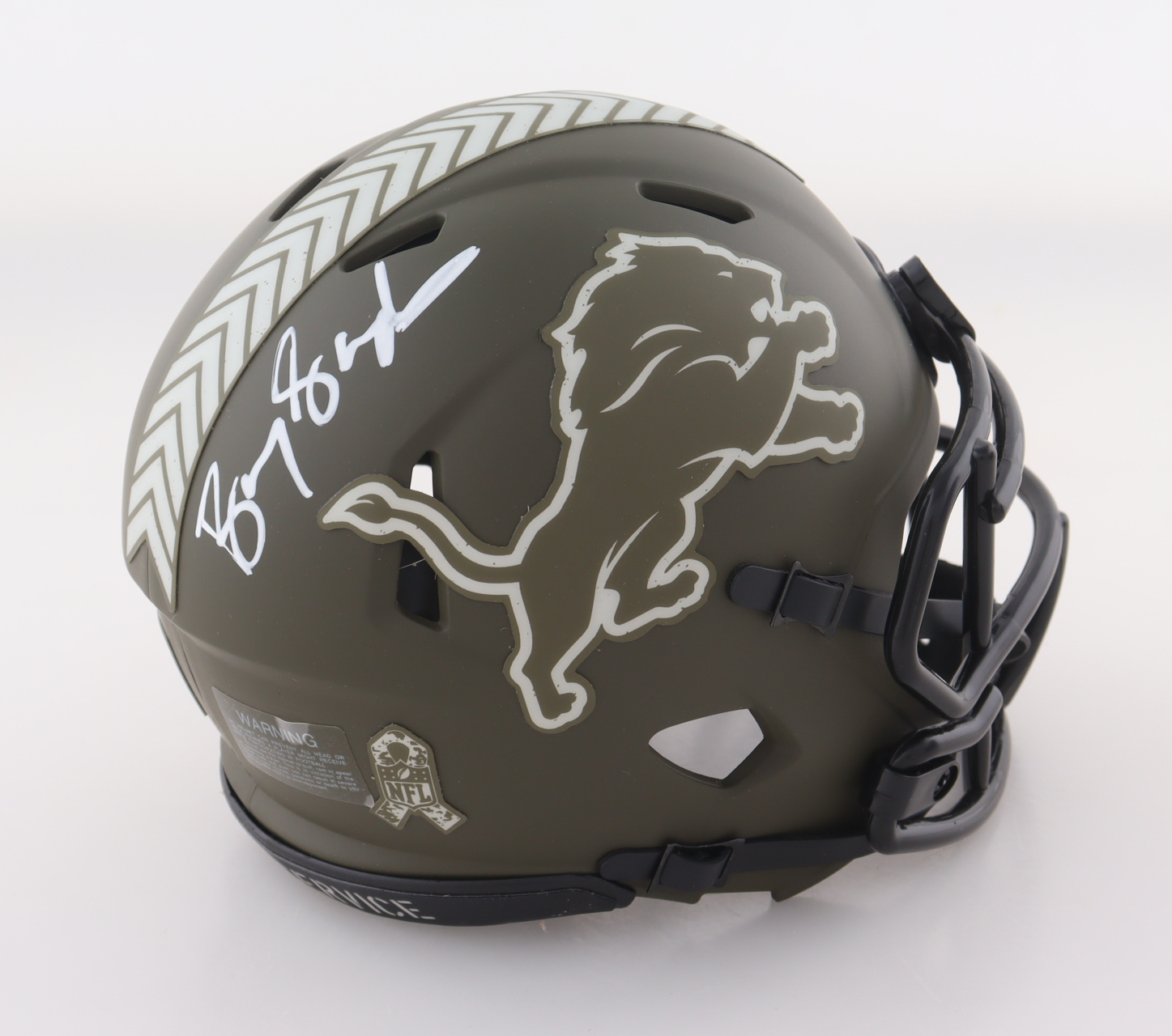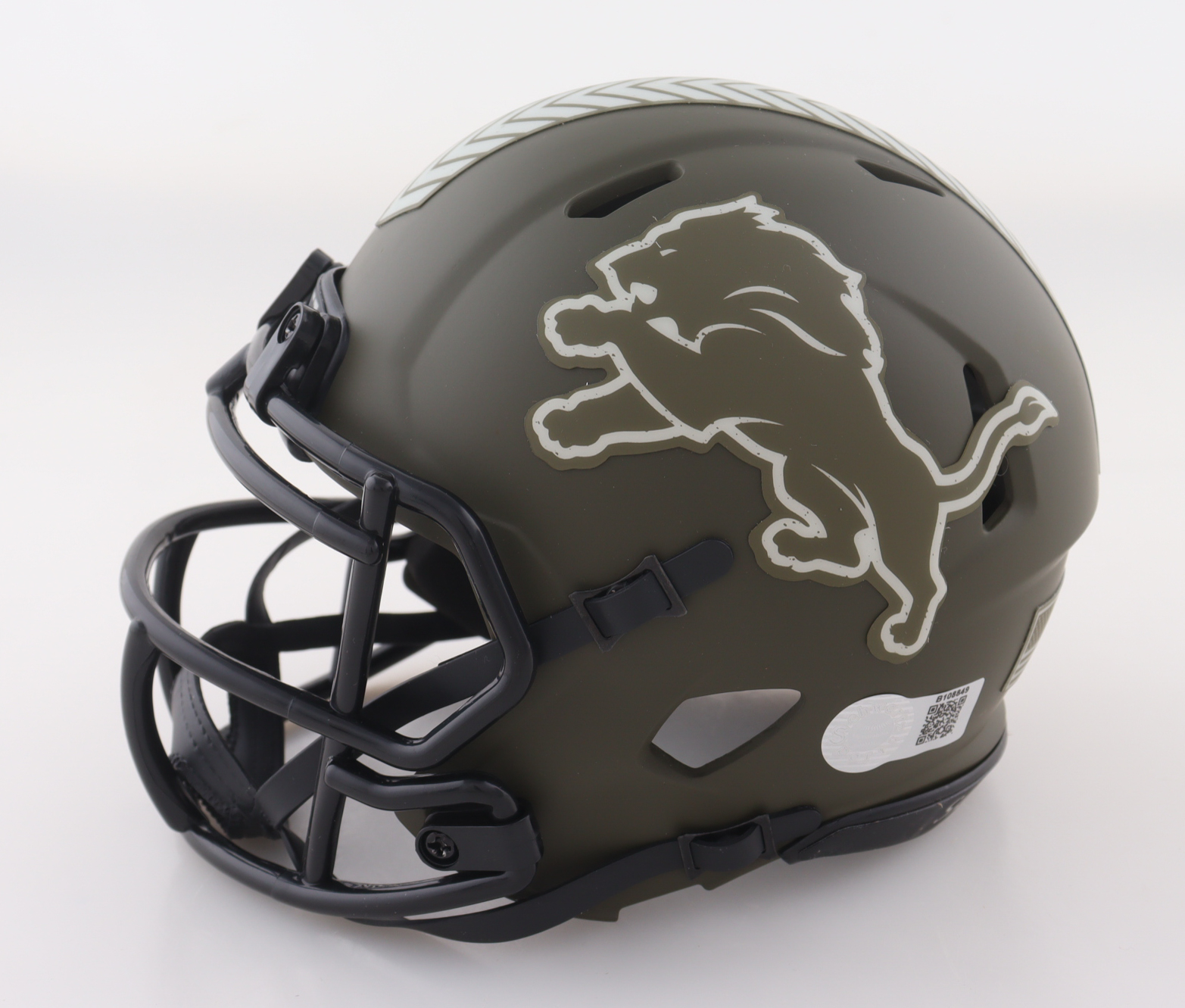 Riddell Detroit Lions Salute to Service Alternate Speed Mini Helmet has been hand-signed by Barry Sanders (HOF).