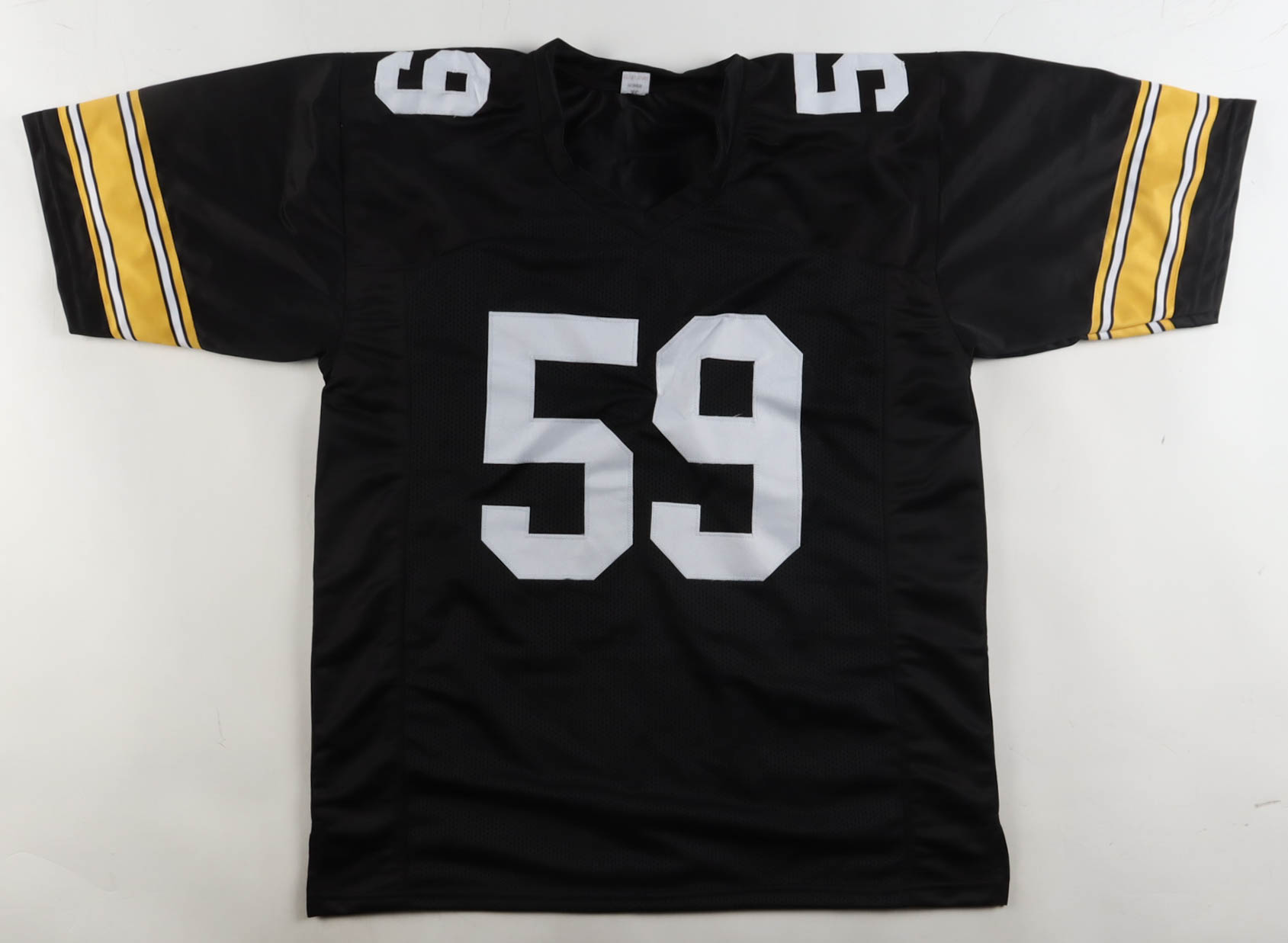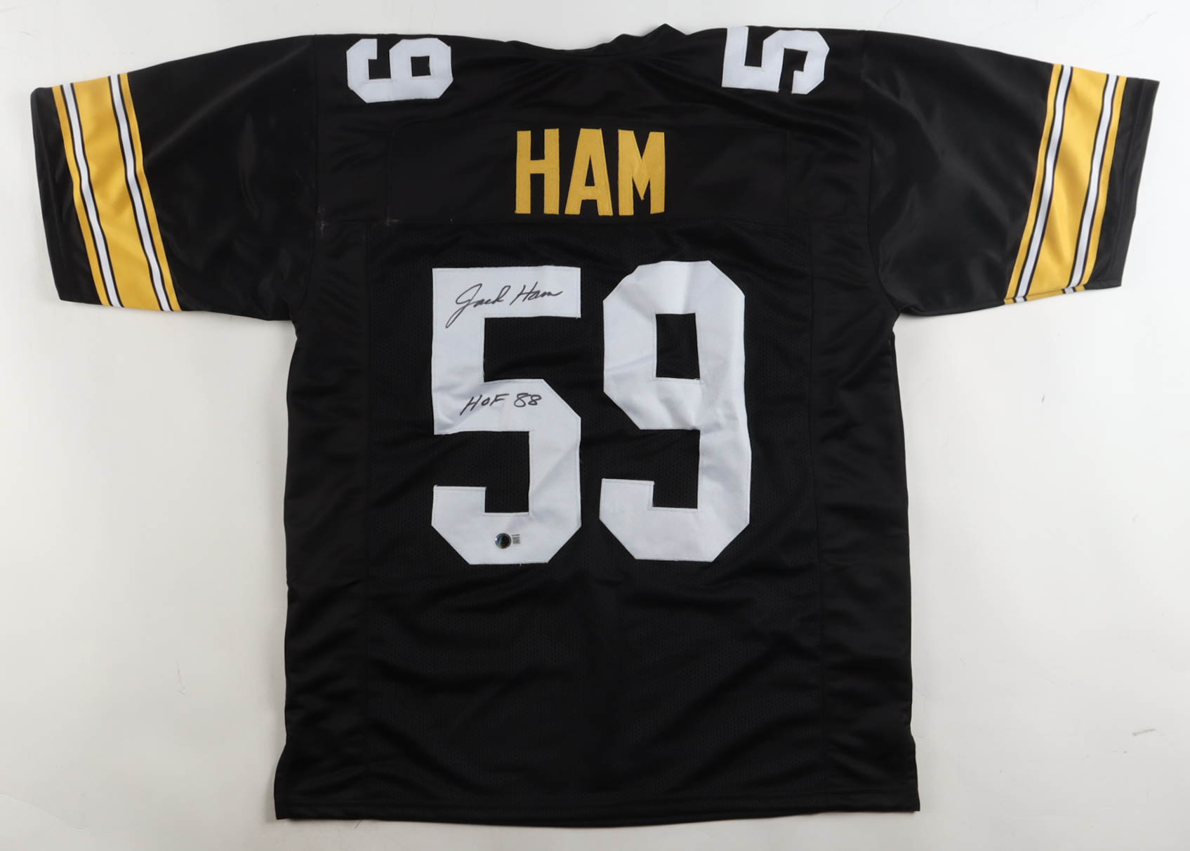 Custom jersey with everything sewn on, size XL. Hand-signed and inscribed by Jack Ham (Pittsburgh Steelers, HOF). Please note, the glue is visible through the reverse numbers.