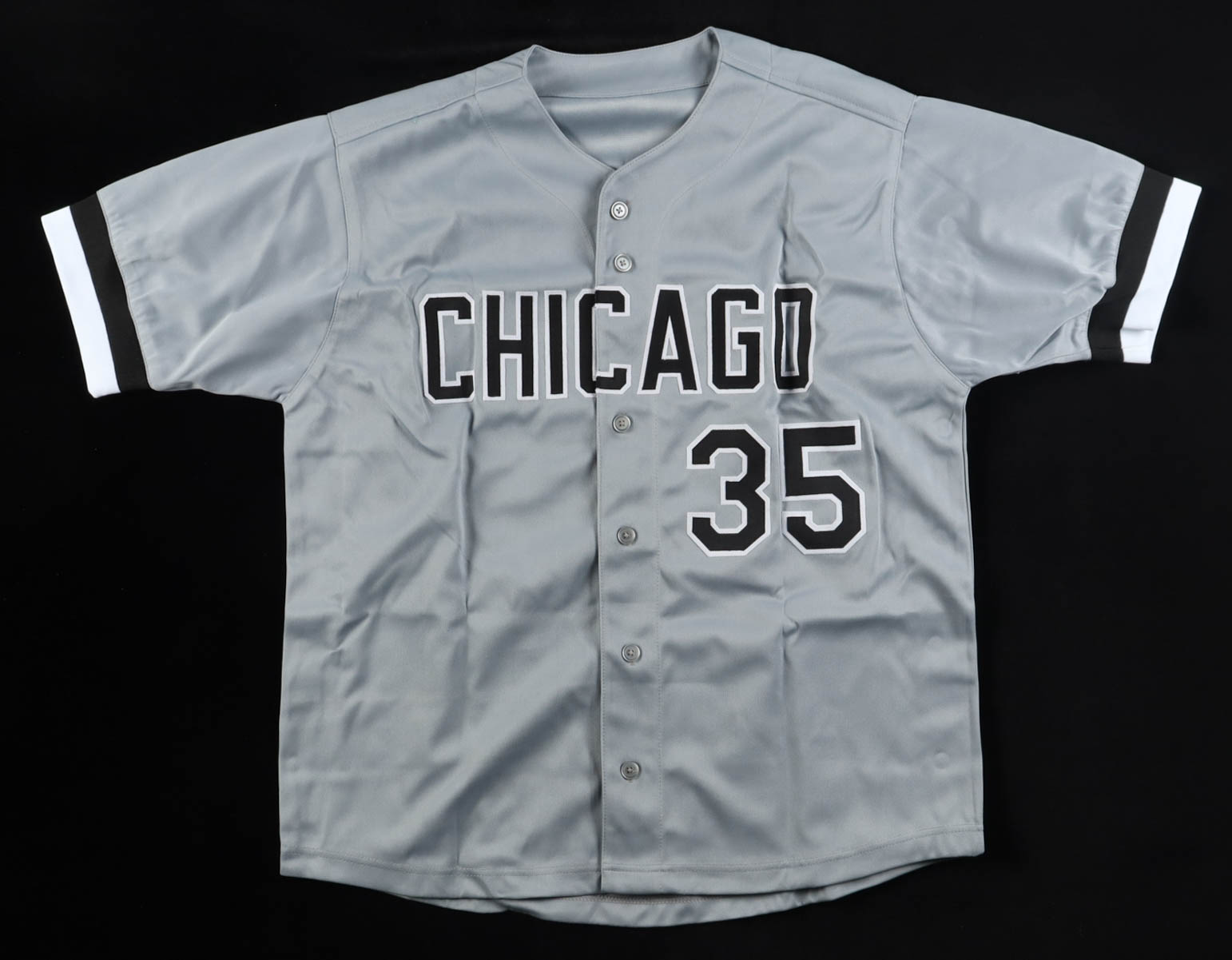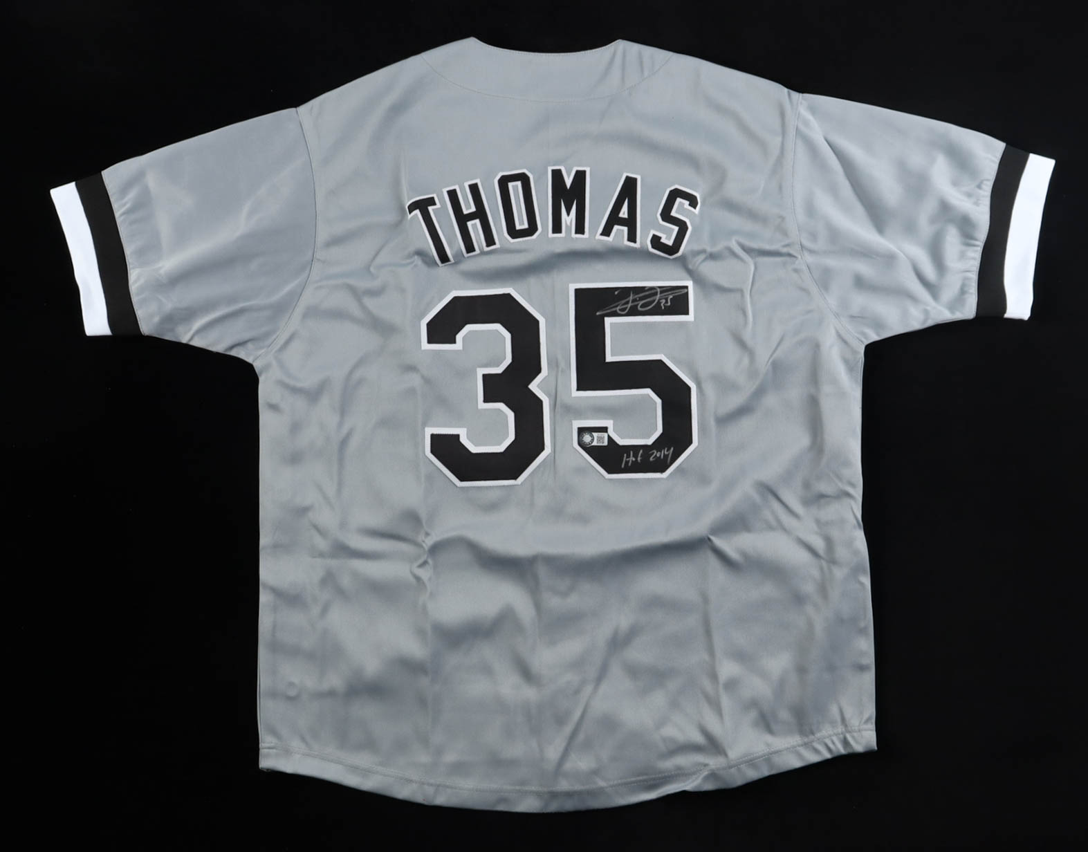 Custom jersey with everything sewn on, size XL. Hand-signed and inscribed by Frank Thomas (HOF).