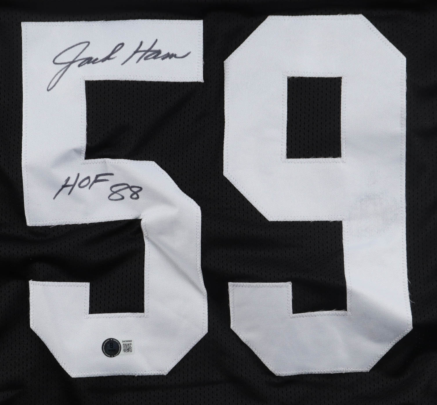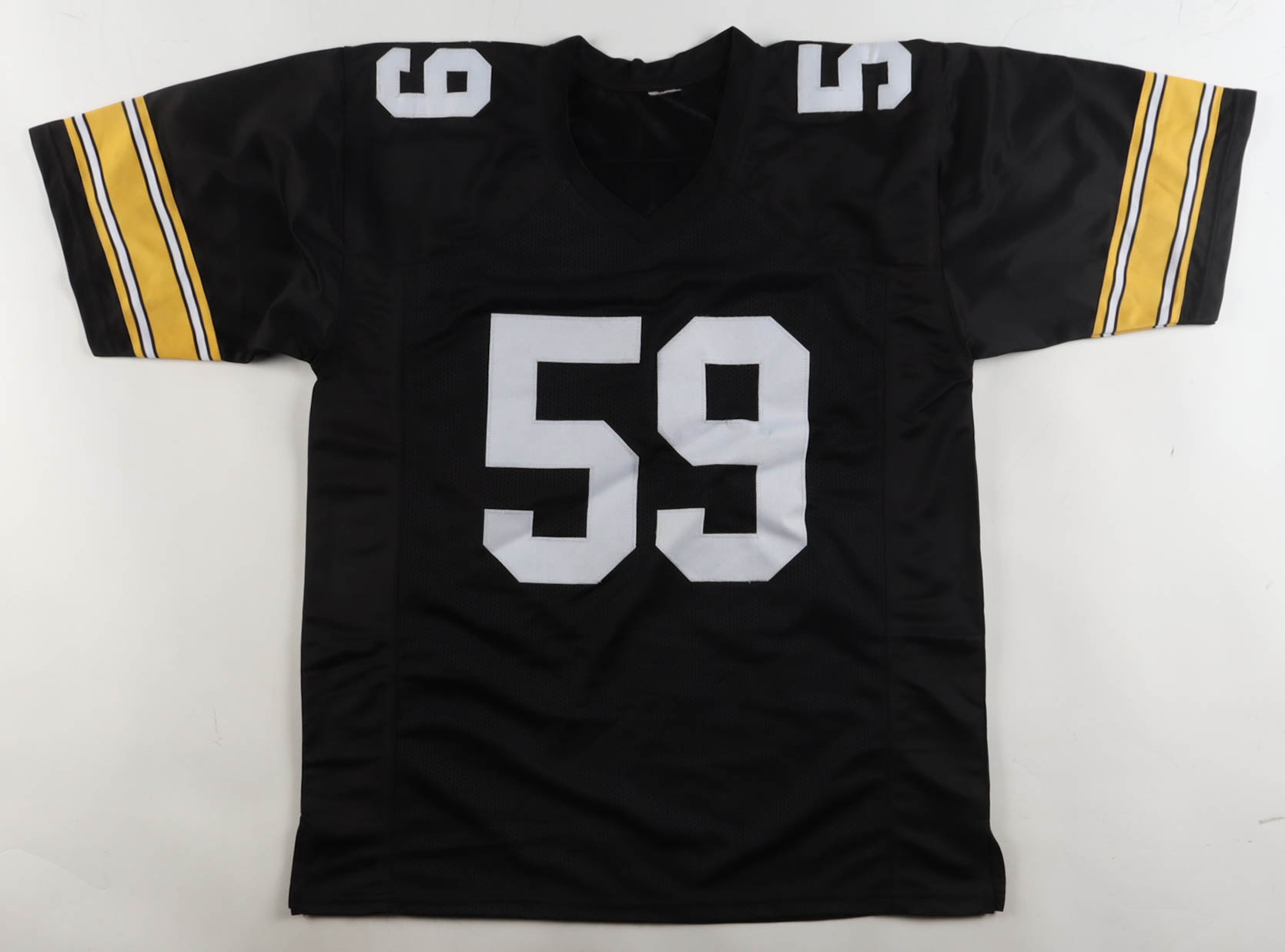 Custom jersey with everything sewn on, size XL. Hand-signed and inscribed by Jack Ham (Pittsburgh Steelers, HOF). Please note, the glue is visible through the reverse numbers.
