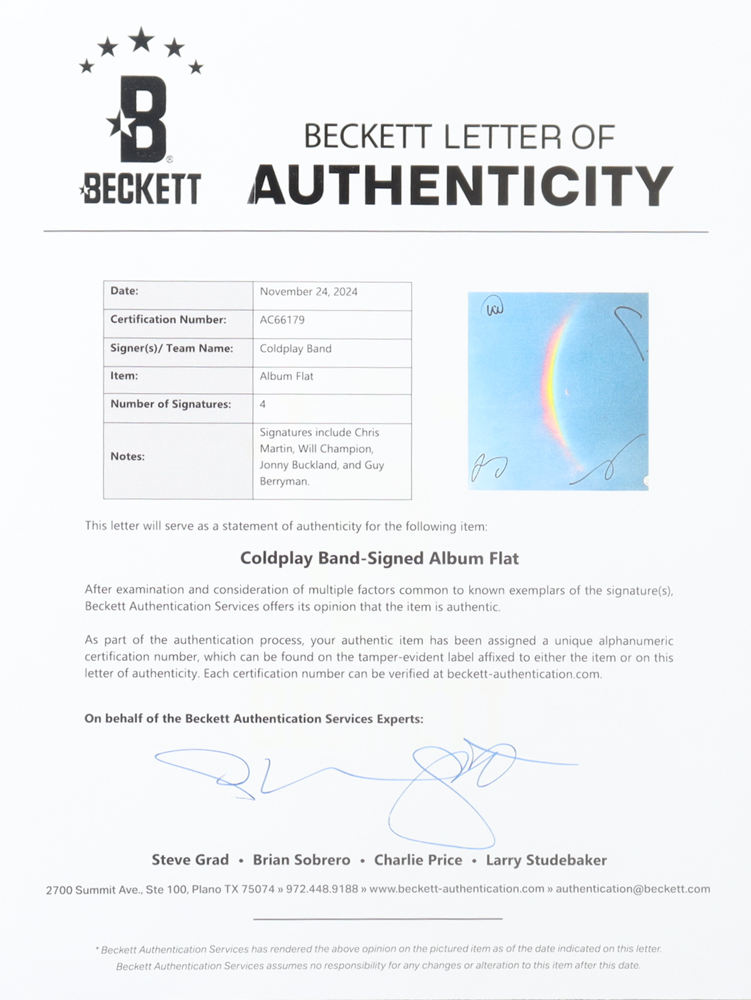 Album Flat has been hand-signed by Chris Martin, Guy Berryman, Jonny Buckland, and Will Champion. Please note, the record and sleeve are not included.