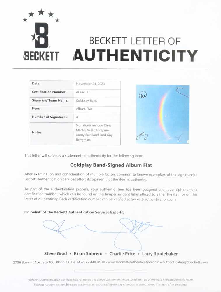 Album Flat has been hand-signed by Chris Martin, Guy Berryman, Jonny Buckland, and Will Champion. Please note, the record and sleeve are not included.