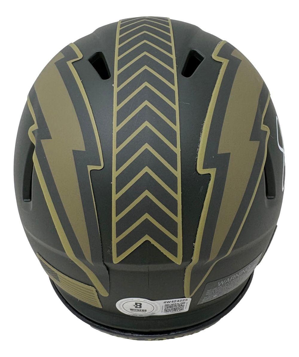 Riddell Los Angeles Chargers salute to service alternate speed mini helmet has been hand-signed by Shawn Merriman.