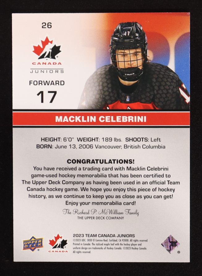 Macklin Celebrini 2023-24 Upper Deck Team Canada Juniors Jerseys U18 Game-Used #26