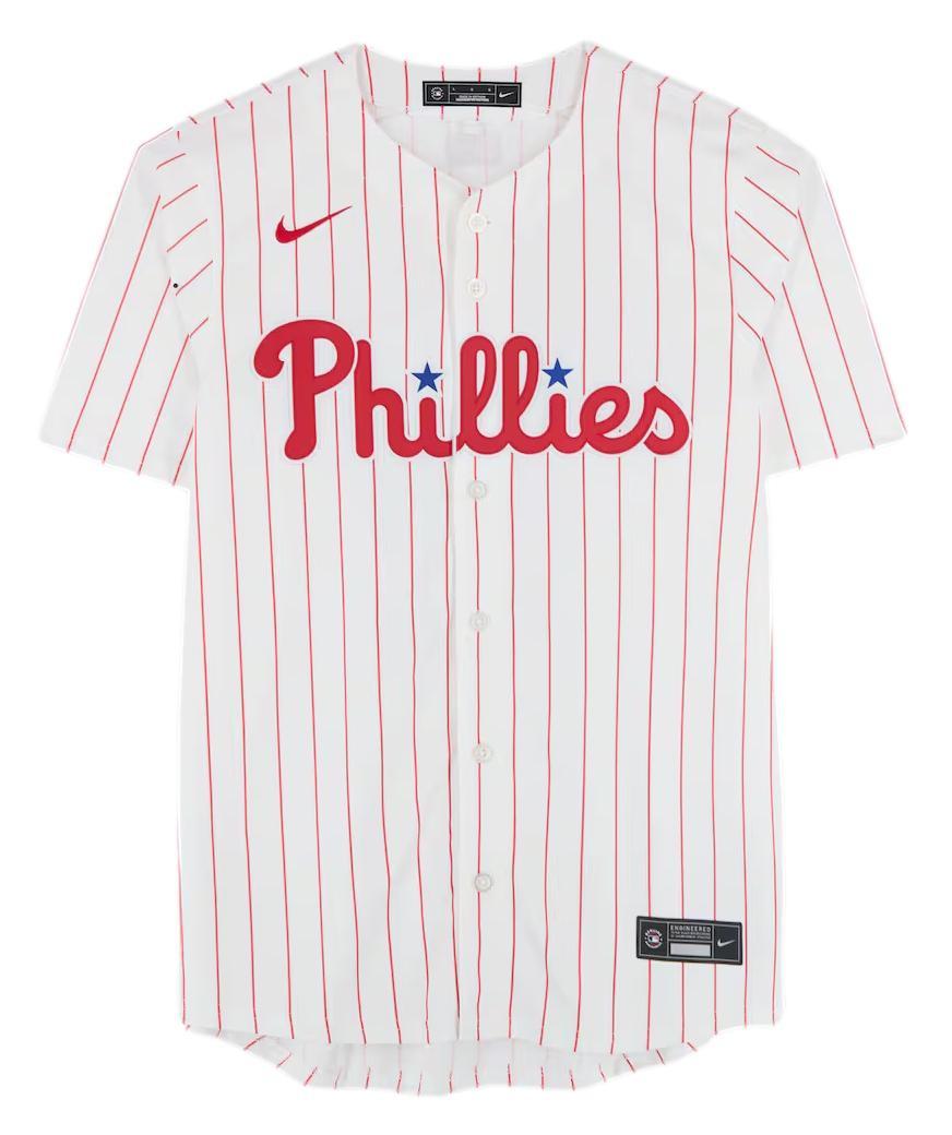 Nike jersey. Everything is sewn/printed on, size large. Hand-signed by Kyle Schwarber (Philadelphia Phillies).