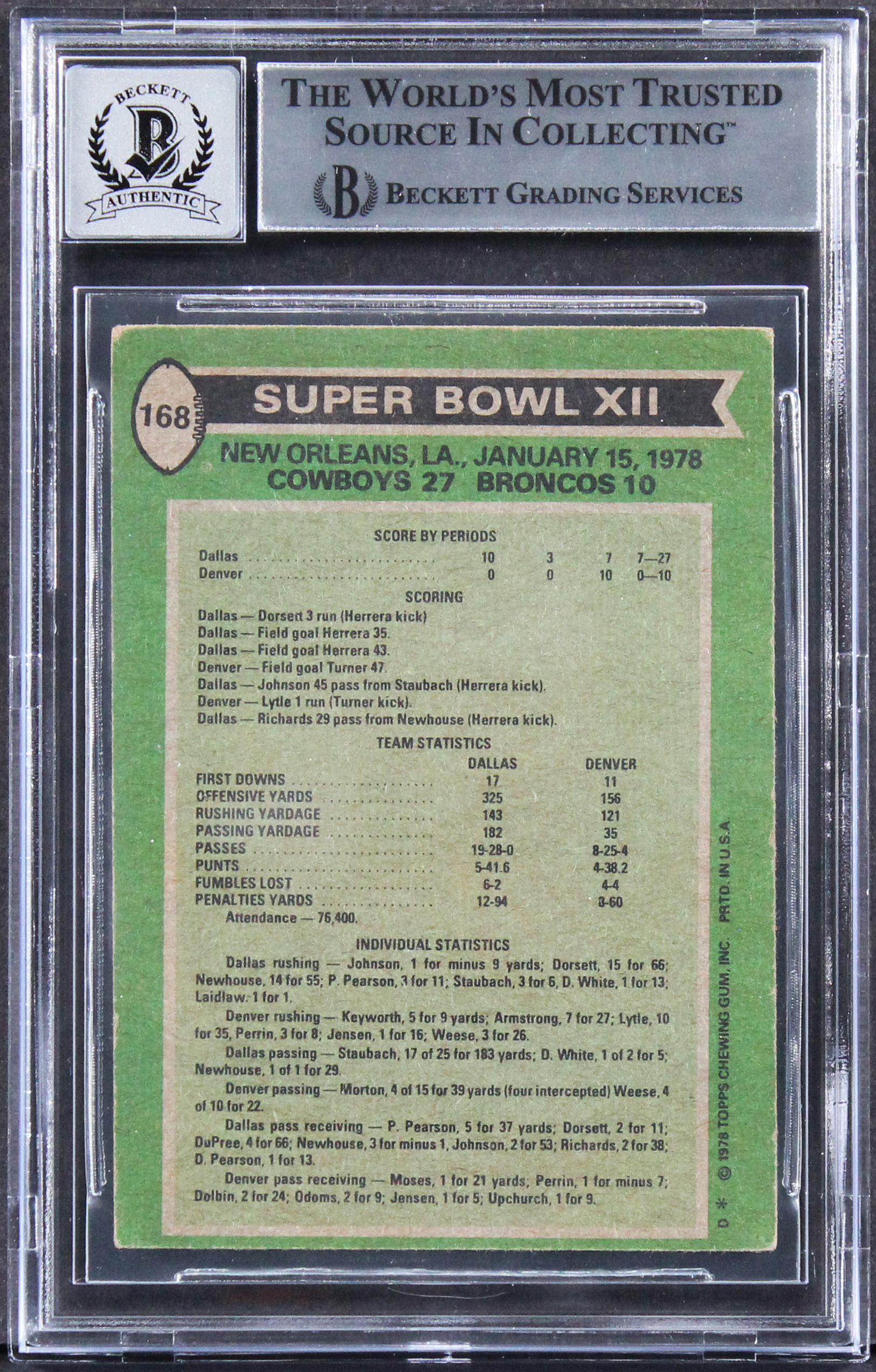 Tony Dorsett Signed 1978 Topps #168 Super Bowl XII / Cowboys 27 - Broncos 10 (BGS)
