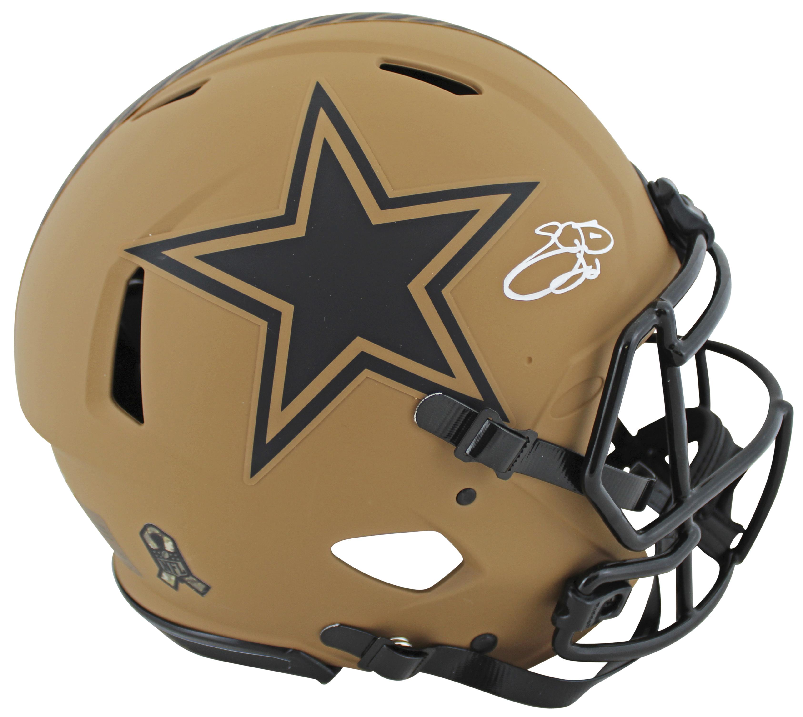 Riddell Dallas Cowboys full-size authentic on-field salute to service alternate speed helmet. Hand-signed by Emmitt Smith (HOF). Display case is included as shown.