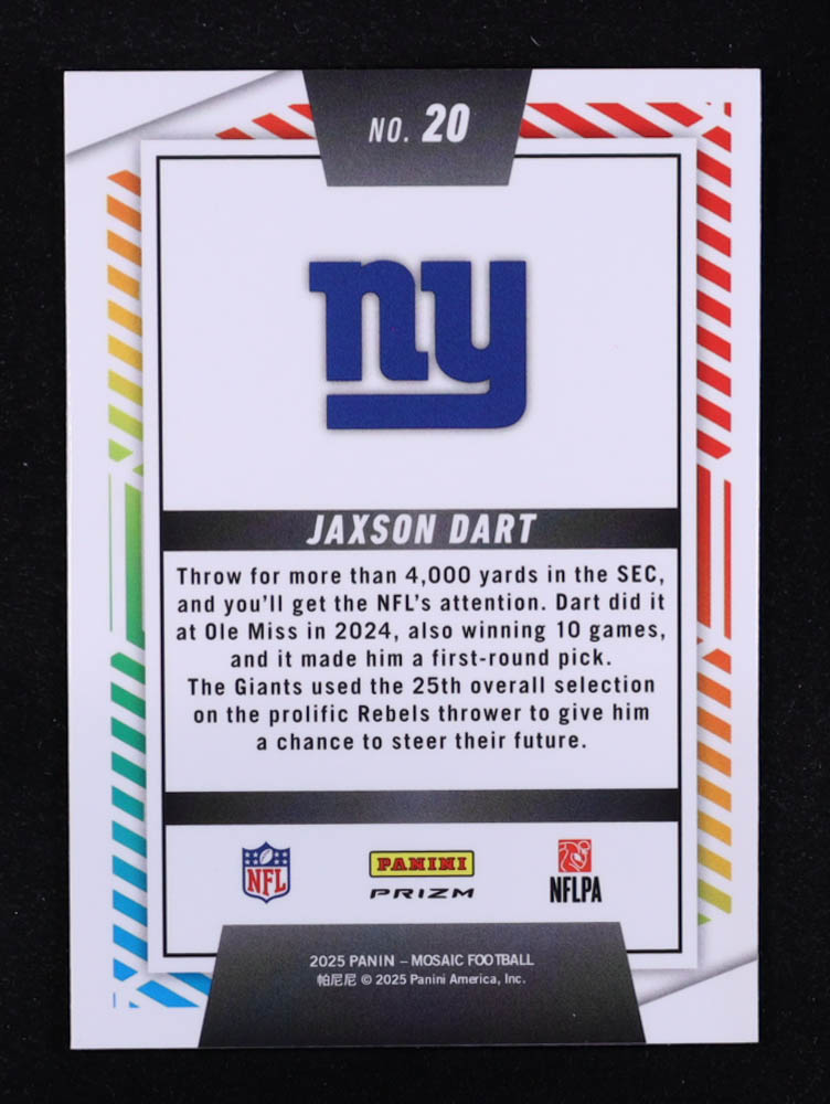 Jaxson Dart 2025 Panini Mosaic Men of Mastery No Huddle Silver #20 RC