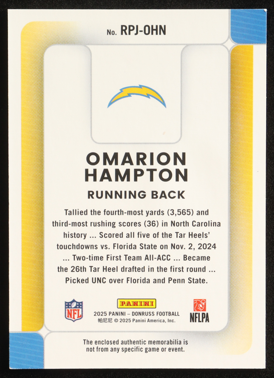 Omarion Hampton 2025 Donruss Rookie Phenom Jerseys #21 RC