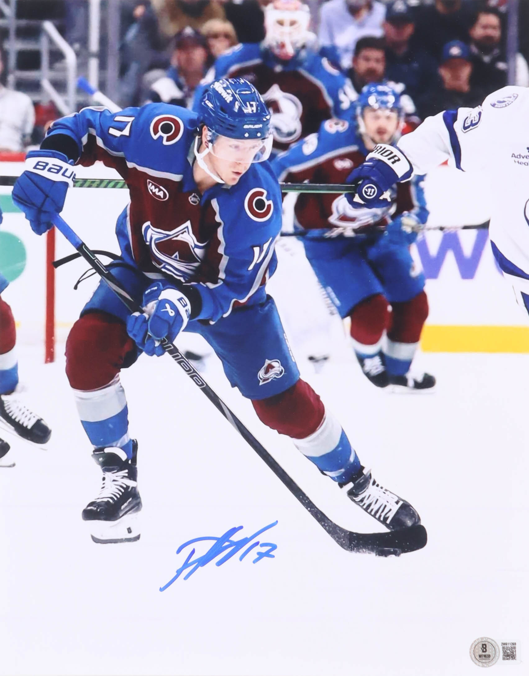 Photo measures 11" x 14" in size. Hand-signed by Parker Kelly (Colorado Avalanche).