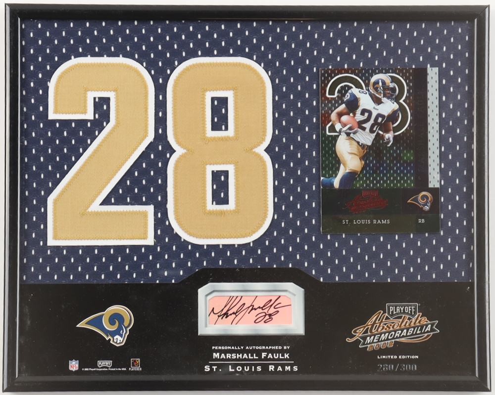 Custom frame measures approximately 8" x 10" in size and features a jersey patch and is hand-signed by Marshall Faulk (Louis Rams, HOF). Note that the item has been labeled Limited Edition # 280 / 300.