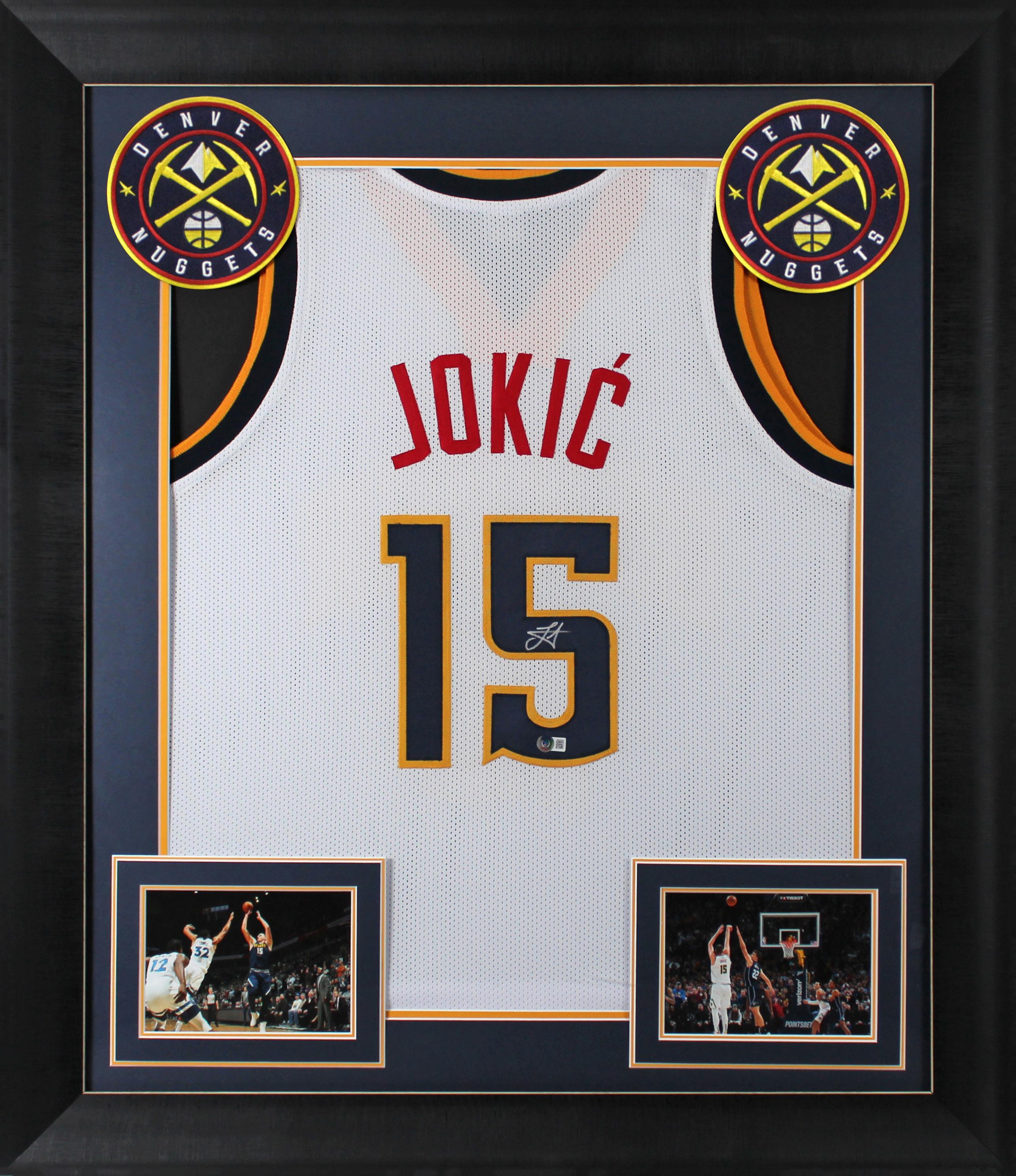 Custom framed display measures approximately 32" x 37" in size and features a jersey that has been hand-signed by Nikola Jokic (Denver Nuggets).