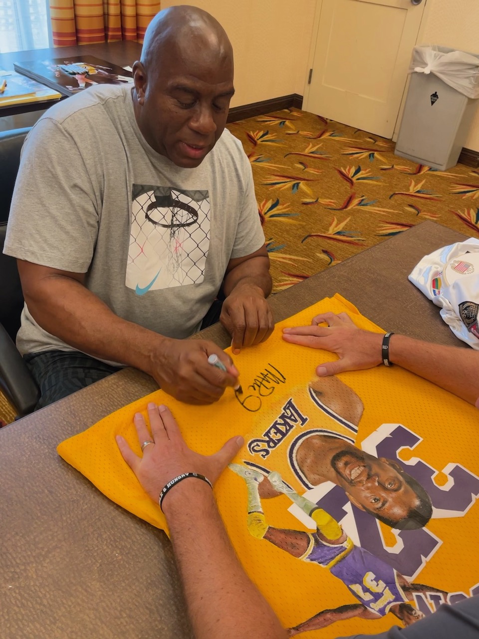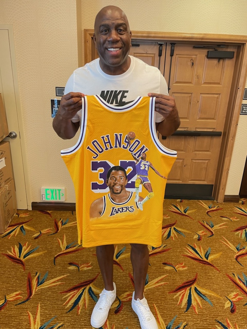 Custom framed display measures approximately 36.5" x 45" in size and features a jersey that has been hand-signed and inscribed by Magic Johnson (Los Angeles Lakers, HOF).
