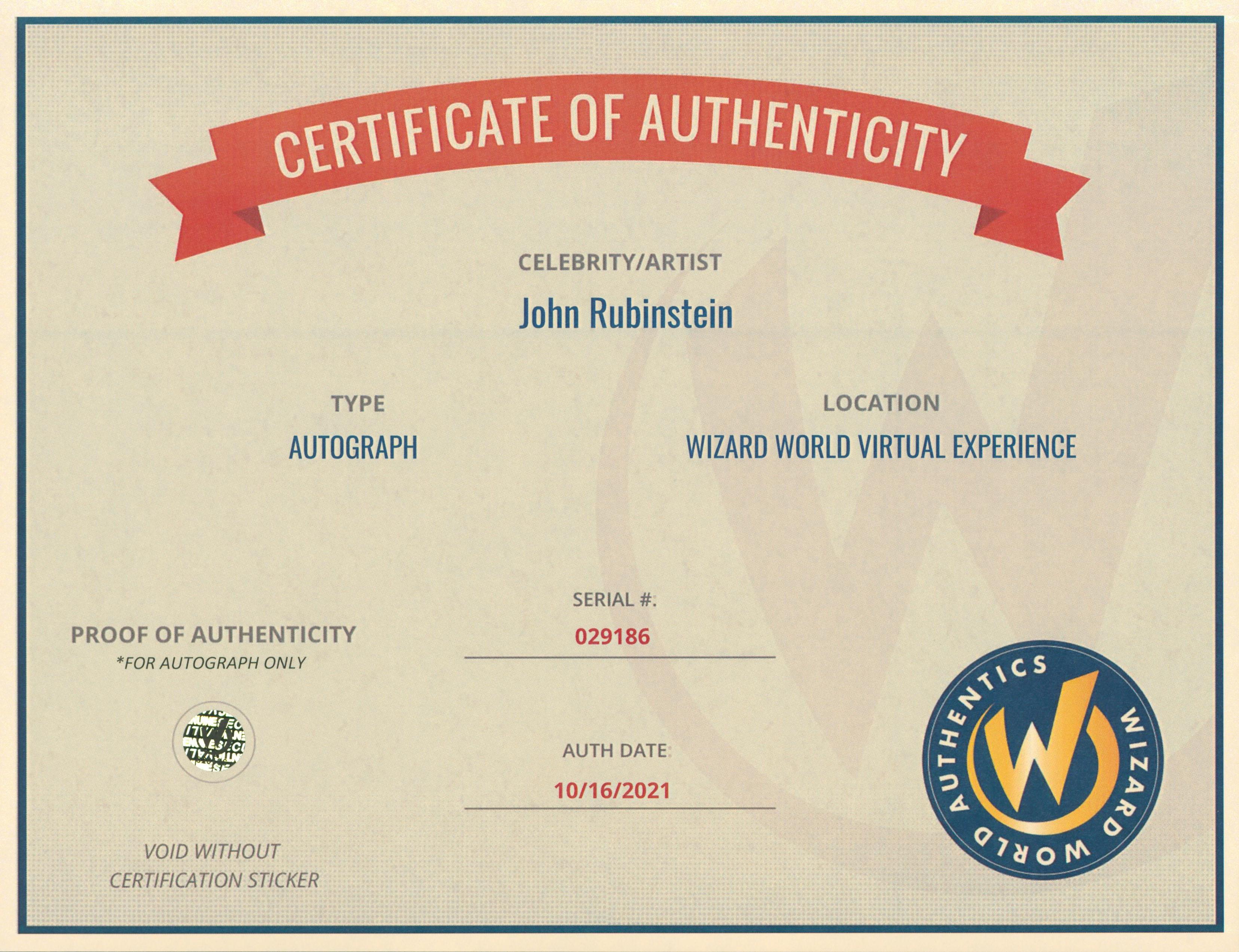Photo measures approximately 8" x 10" in size and has been hand-signed by John Rubinstein.