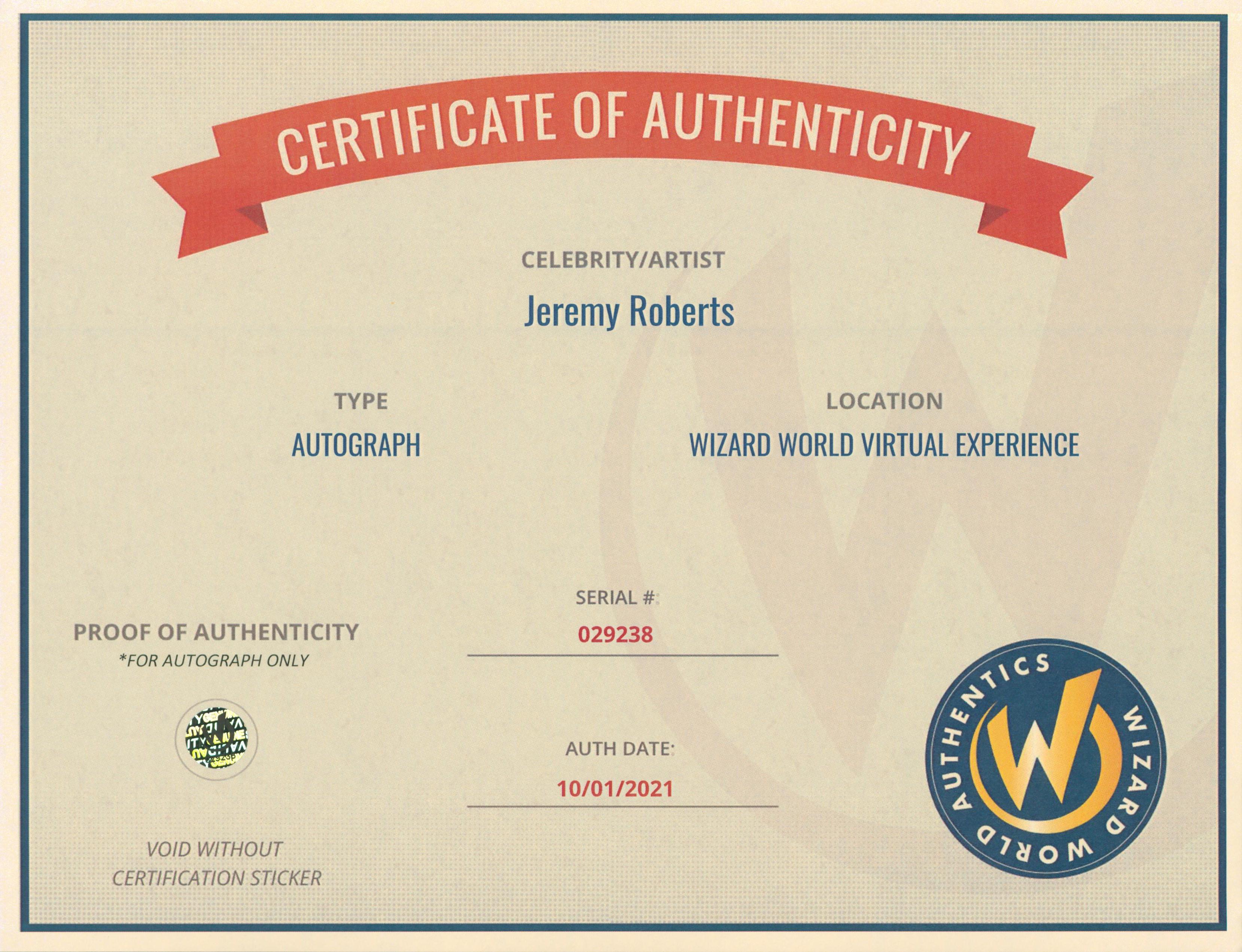 Photo measures approximately 8" x 10" in size and has been hand-signed by Jeremy Roberts.