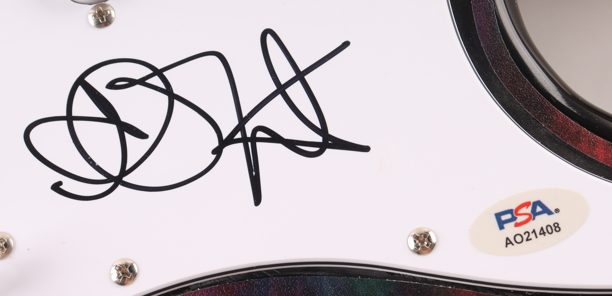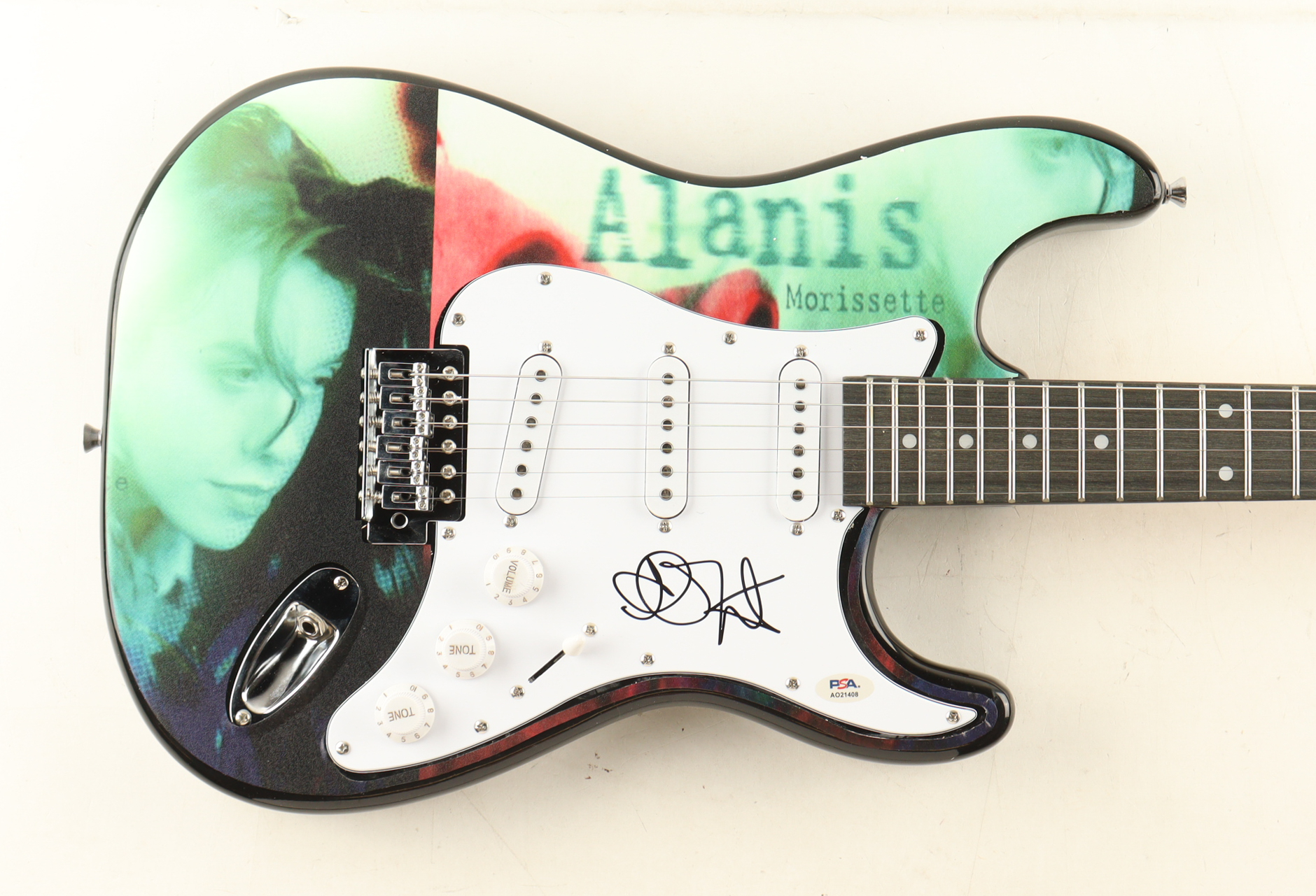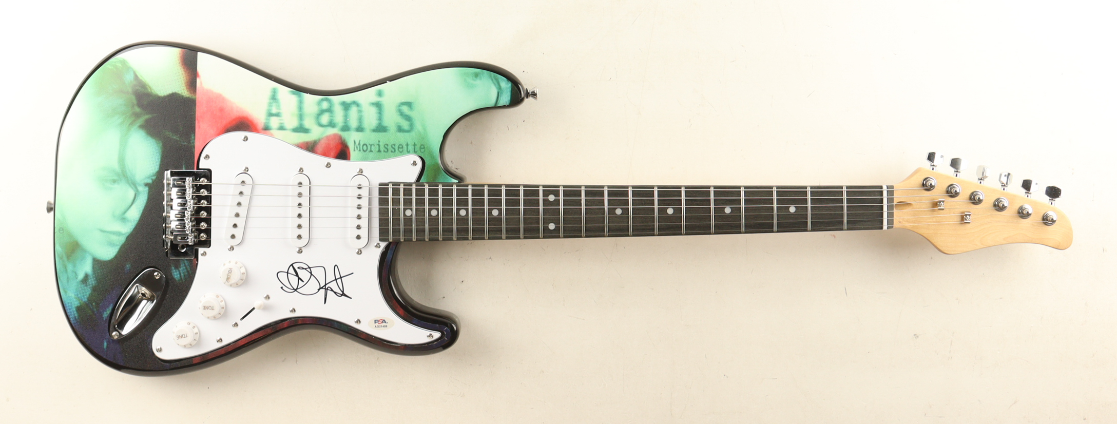 Fender-style electric guitar has been hand-signed by Alanis Morissette.