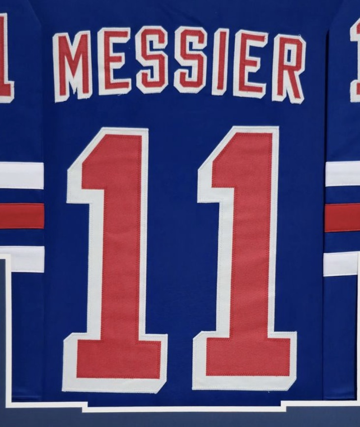Custom frame measures 34" x 42” in size and features an unsigned jersey of Mark Messier. See photos for condition.