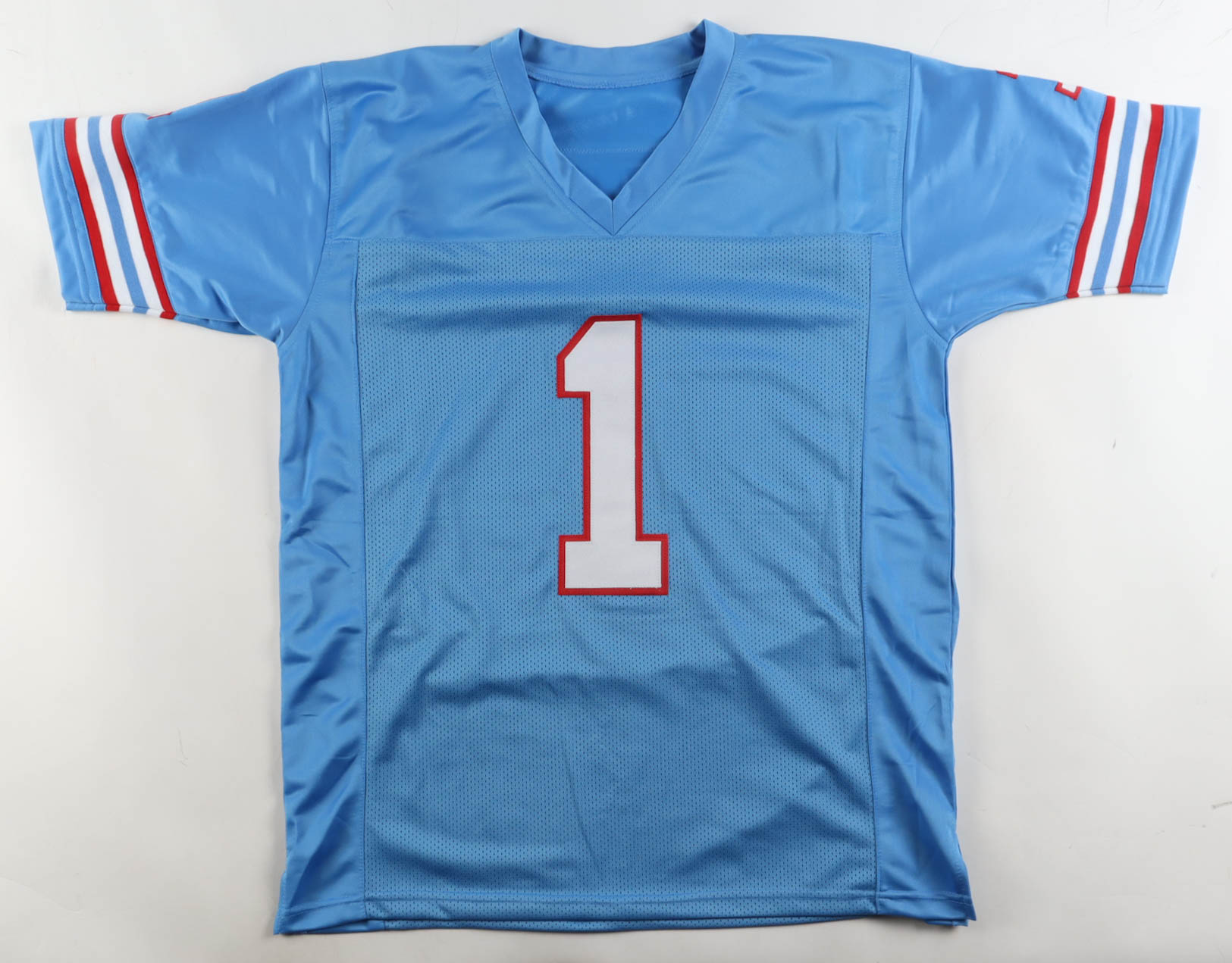 Custom jersey with everything sewn on, size XL. Hand-signed and inscribed by Warren Moon (HOF).