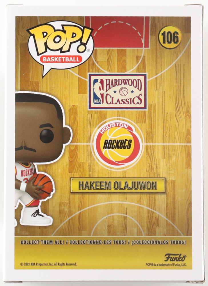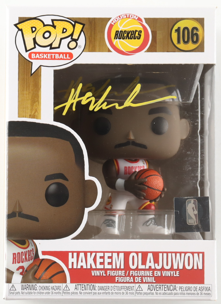 Vinyl figure measures approximately 4" in height and has been hand-signed on the packaging by Hakeem Olajuwon (Houston Rockets, HOF).