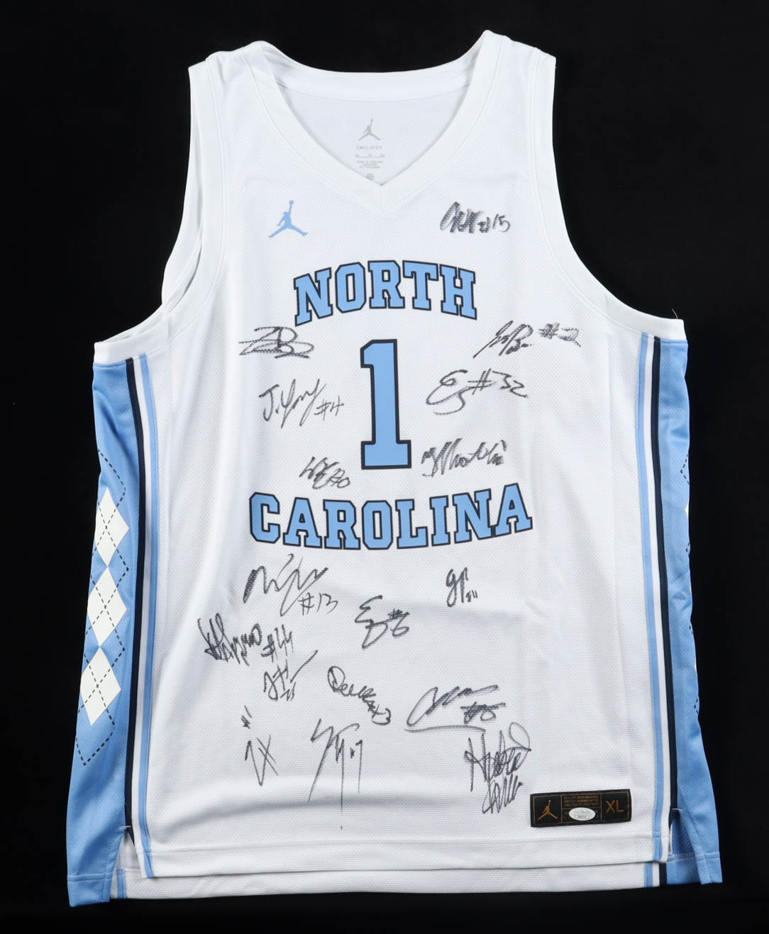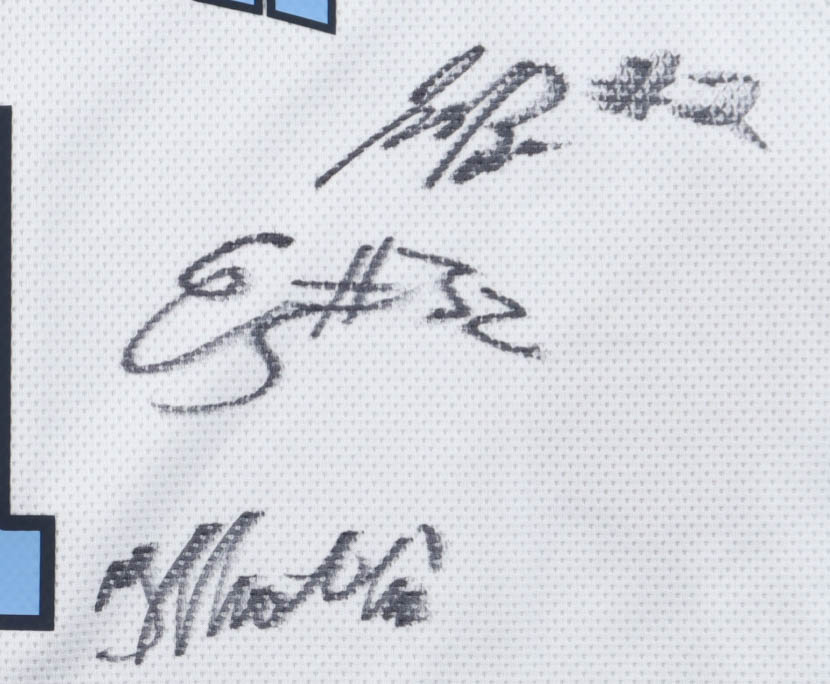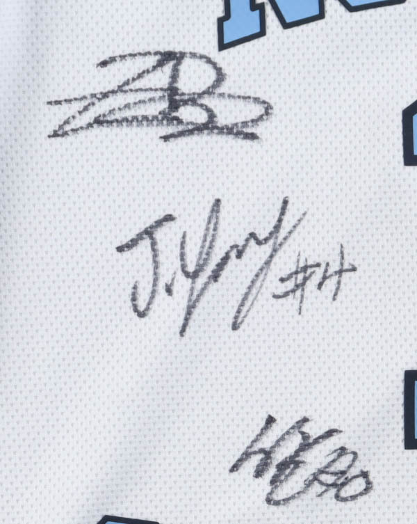 Jordan jersey with everything pressed on, size XL. Team-signed by (17) members of the North Carolina Tar Heels, including Hubert Davis, Caleb Wilson, Seth Trimble, Henri Veesar, Jarin Stevenson, Kyan Evans, Derek Dixon, Luka Bogavac, Jonathan Powell, Elijah Davis, Elija Zayden High, James Brown, Jaydon Young, Ivan Matlekovic, Evan Smith, John Holbrook, and Isaiah Denis