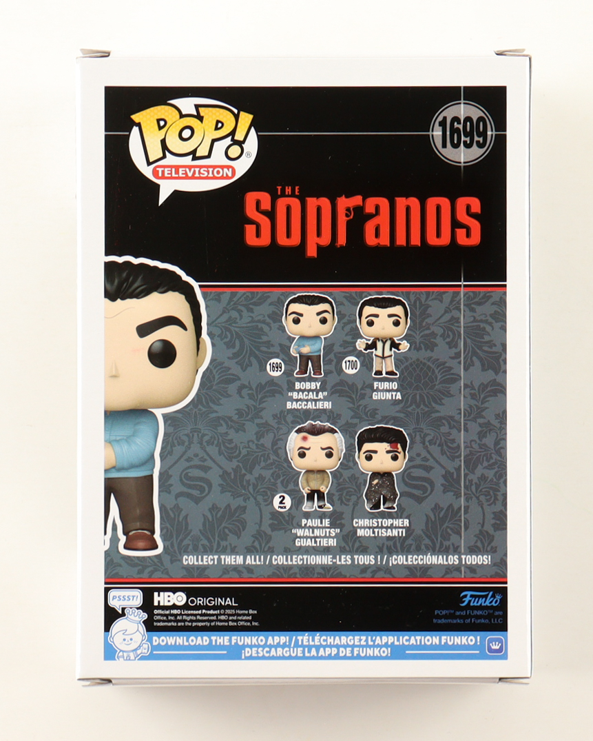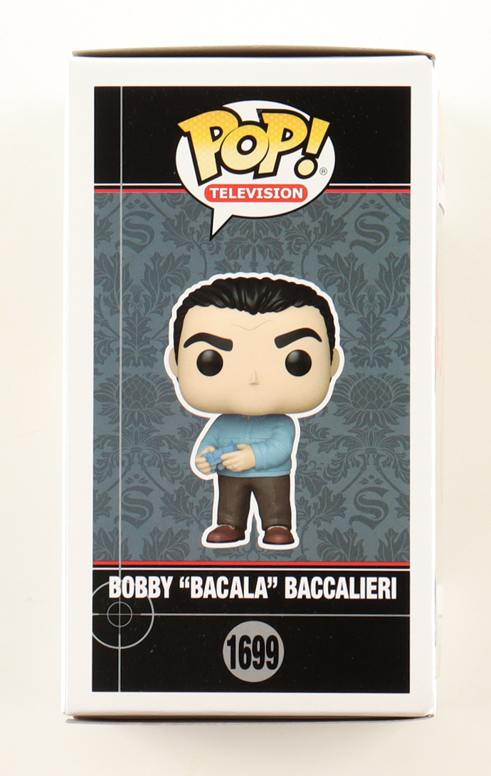 Funko pop! vinyl figure measures approximately 4" tall. Hand-signed on the packaging by Steve Schirripa (Bobby Bacalieri).