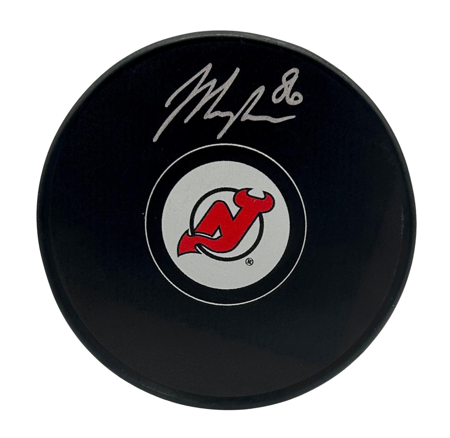 New Jersey Devils logo puck has been hand-signed by Jack Hughes.
