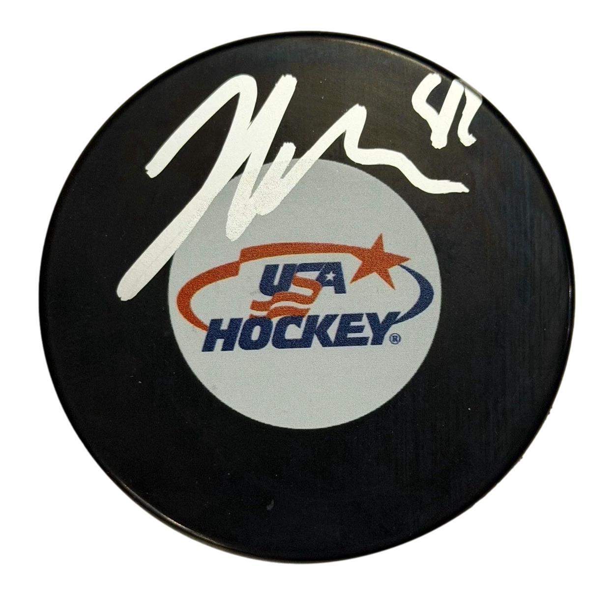 USA Hockey logo puck has been hand-signed by Jack Hughes.