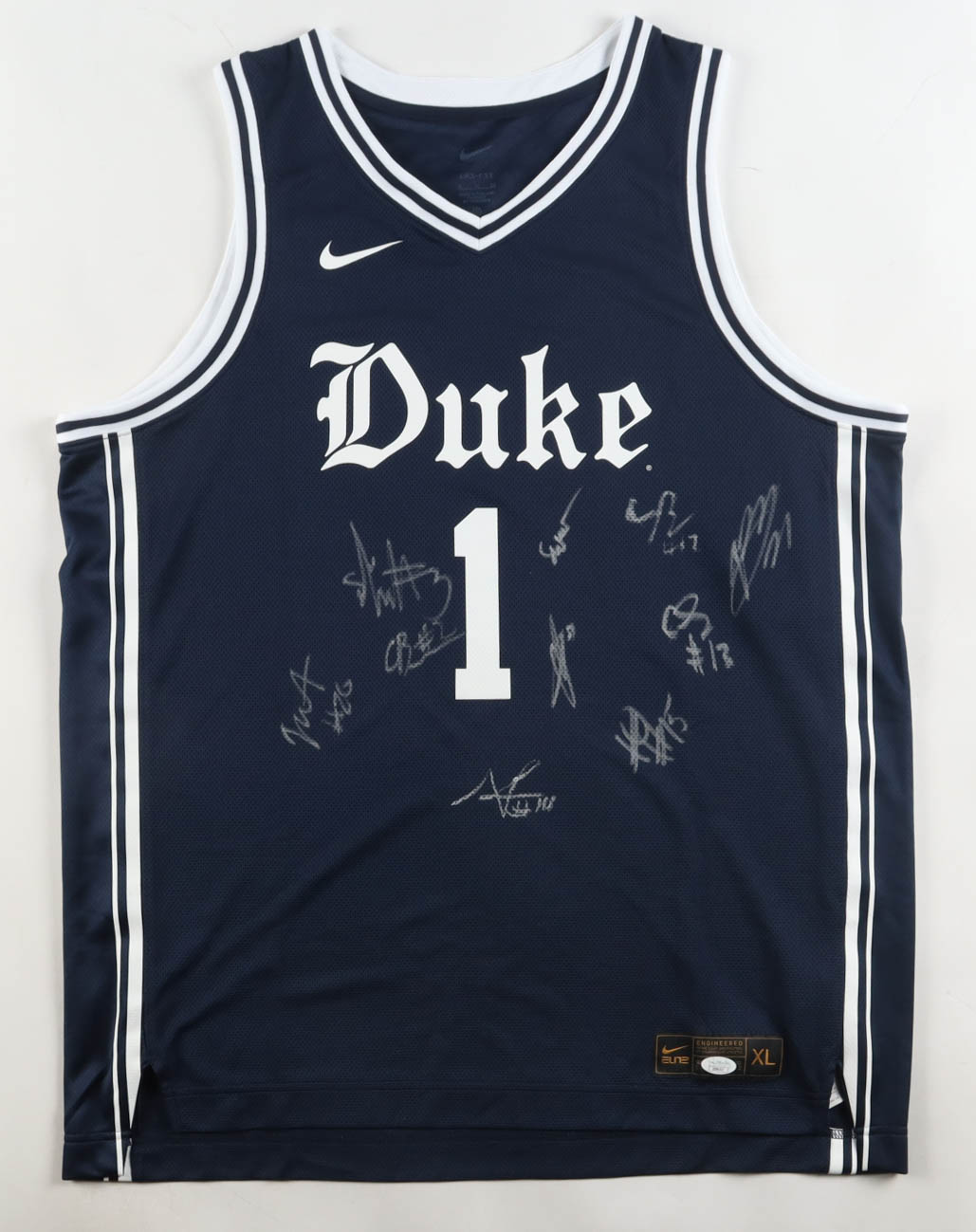 Nike jersey with everything pressed on, size XL. Team-signed by (10) members of the Duke Blue Devils, including Cameron Boozer, Isaiah Evans, Caleb Foster, Patrick Ngongba, Cayden Boozer, Nikolas Khamenia, Cameron Sheffield, Jack Scott, Sebastian Wilkins, and Ifeanyi Ufochukwu.