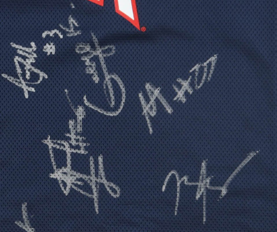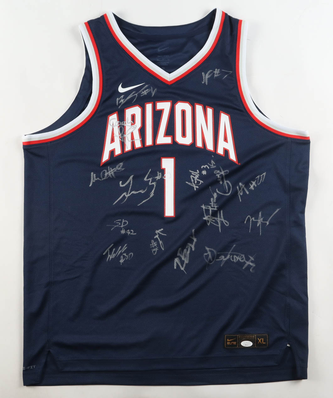Nike jersey with everything pressed on, size XL. Team-signed by (16) members of the Arizona Wildcats, including Head Coach Tommy Lloyd, Koa Peat, Brayden Burries, Jaden Bradley, Bryce James, Ivan Kharchenkov, Motiejus Krivas, Tobe Awaka, Addison Arnold, Jackson Francois, Mabel Mawut, Anthony Dell'Orso, Dwayne Aristode, Sven Djopmo, and Sidi Gueye.